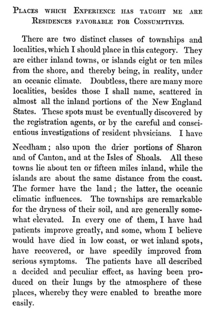 [Above paragraph requoted and sectioned] Dr. Ellis, of Bristol, Rhode Island, has noticed that few persons are affected with consumption in Bristol, compared with the number found in Warren, a few miles distant. Bristol stands on a bold, rocky shore, washed by the waves of a bay, opening upon the Atlantic.