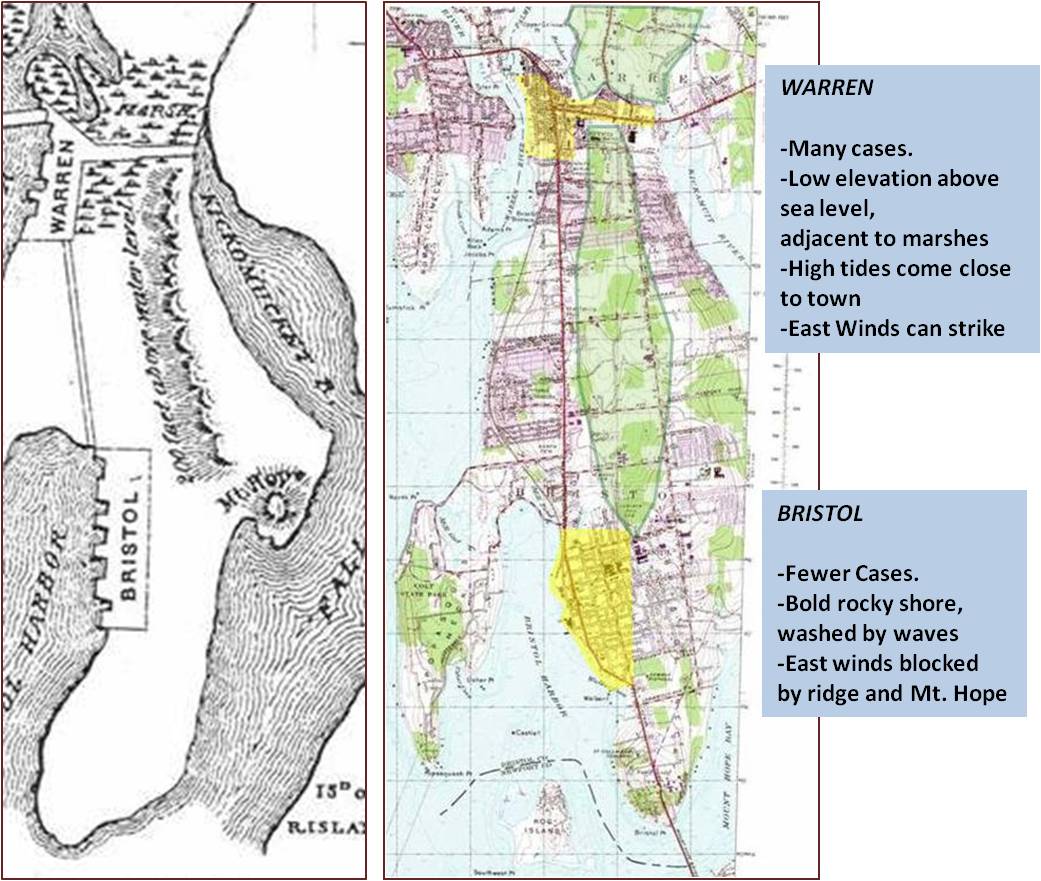 Bowditch’s theory is that dryness is the most important preventative factor for consumption. For the Warren area, dryness is prevented by the presence of marhslands and a low elevation with a topography capable of channeling winds across the marshlands towards the township. For the Bristol area, there are two mountain features that prevent this from happening. The soil or land is drier due to its higher elevation above sealevel. As inferred by Bowditch, the rocky shorelines prevent marshlands and small bays from developing, thus there is no still water settling in the region to increase local humidity and/or result in water-saturated soil and sand layers. Due to its rocky coast, exposure, and lack of prevailing ocean wind patterns from the east, Bristol’s shoreline and sandy, gravelly soil are much drier.