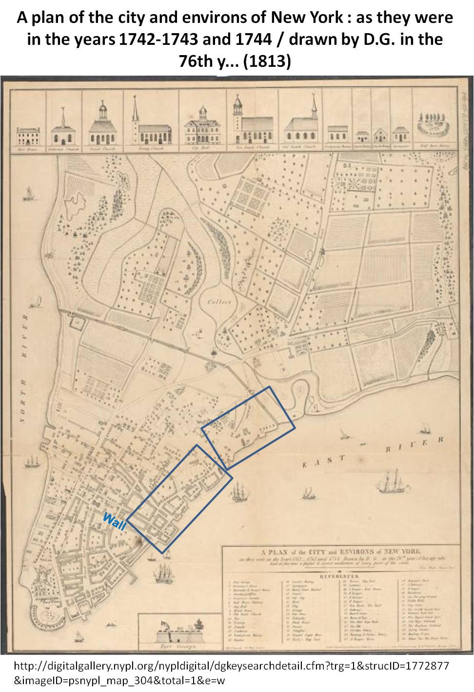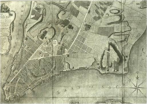 The above map illustrates the environmental history for the section of New York City north of the urban setting. Large farming areas are established, meaning that most of the surface water is due to lowland seasonal wetland field settings, along with a number of flowing brackish waterways, small streams, rivulets, canals and seasonal water ways. The edge of the terrain consists mostly of brackish or mixed fresh-salt water environmental settings, and was rich in sedges, reeds, rush, cattails, phragmites and arundinaria. The related zoology of this setting would make it very likely to be a primary source of the miasma or effluvium so often related to diseases. Anybody residing within 1000 feet from these places would consider his or her residence very susceptible to exposure to these natural causes for fever. Close to the source for this malaria there was the Collect Pond with its long passageway to the East River. This ecological setting was prime territory for mosquito-born diseases. For this reason it is possible this setting experienced occasional malaria, typhoid, or even yellow fever like problems. But the placement of the wetlands needed to harbor these vectors would have been located wither within the natural terrain settings or at the water edge of the urban region, the precursors to the ports built by the 1790s.