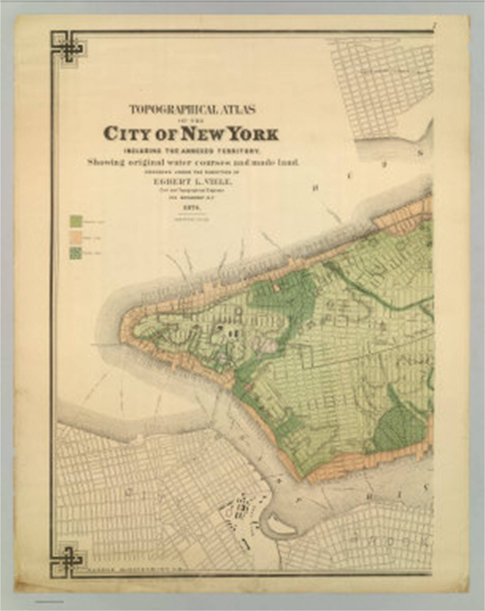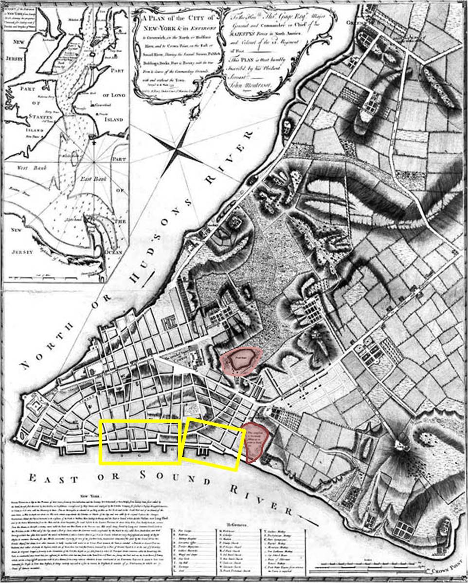 1780 map of Lower Manhattan Island, with the two Yellow Fever regions reviewed by Seaman, and two natural water sources for miasma