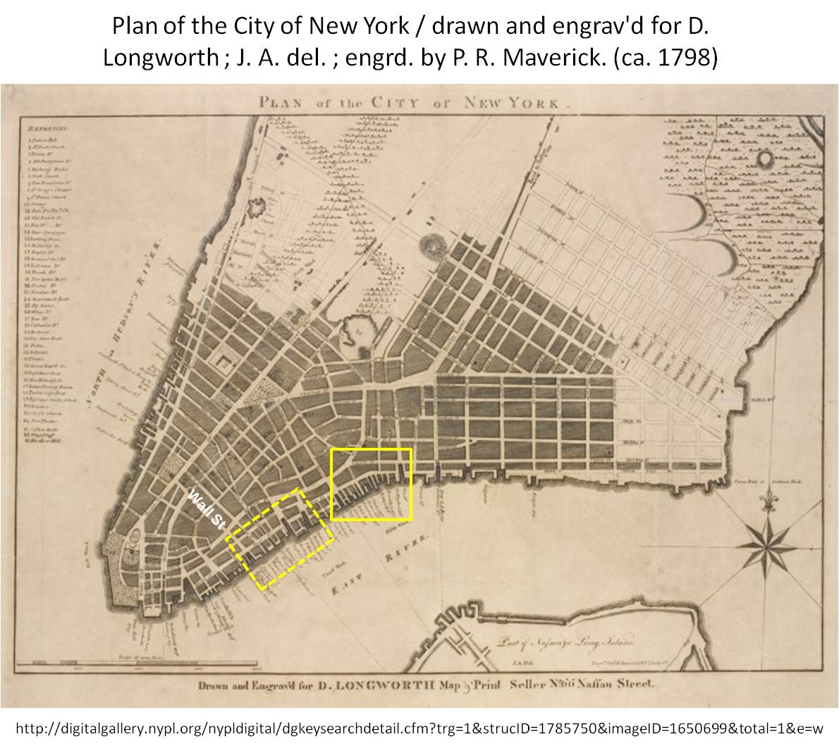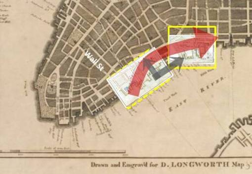 Valentine Seaman’s mapped areas overlain on Longworth’s 1798 map of lower Manhattan Island (Many of the previous water bodies set in the city environment have since been removed by 1798. Collect lake, where one of the first steamboats would be tested by Fulton, remains immediately north of more eastern area highlighted on this map. To the right of that highlighted area was an old marsh-like lowlands setting. Also notice that the fields where some mosquitoes commonly breed are also a considerable distance from the city, located to the north and east. This meant that the ports themselves and nearby dumping areas were more than likely the mosquito source for these epidemics once the species were introduced by incoming ships. If the mosquitoes behave then as they do today, any garbage capable of holding water would have been capable of breeding the imported mosquitoes responsible for yellow fever.)