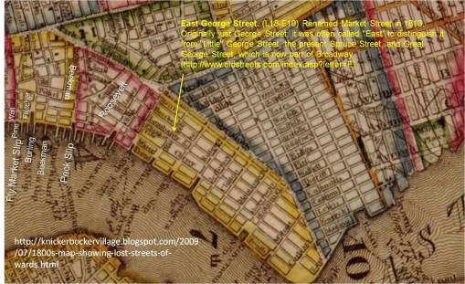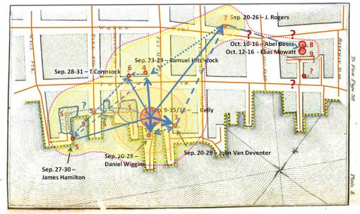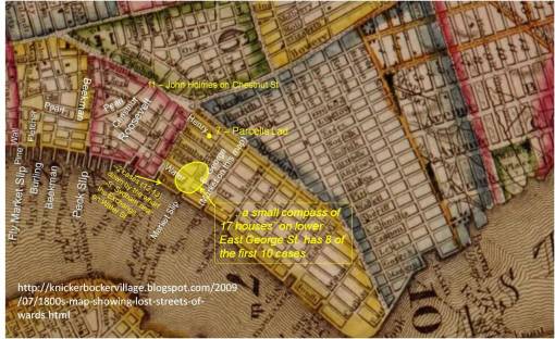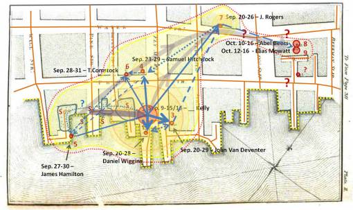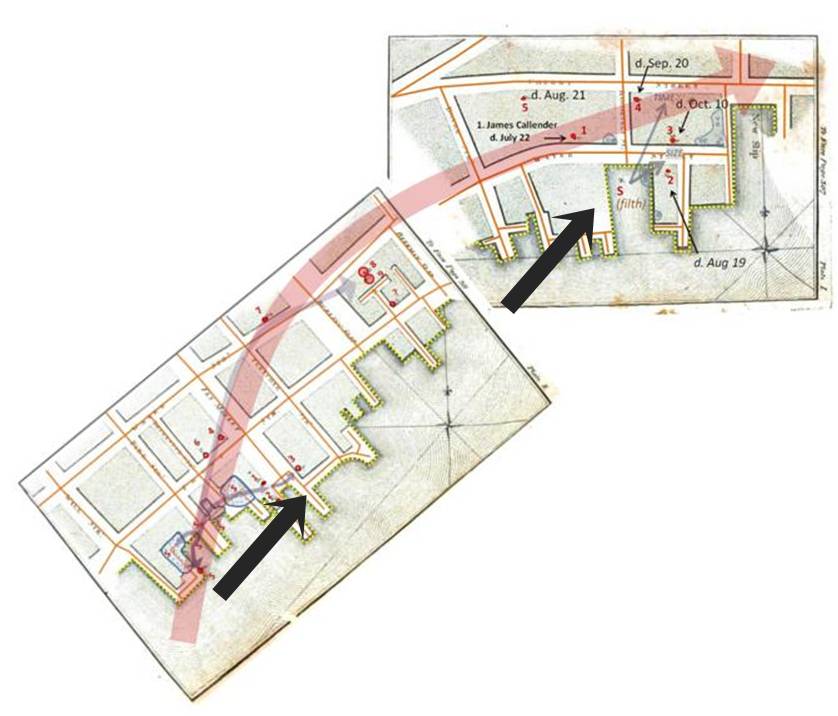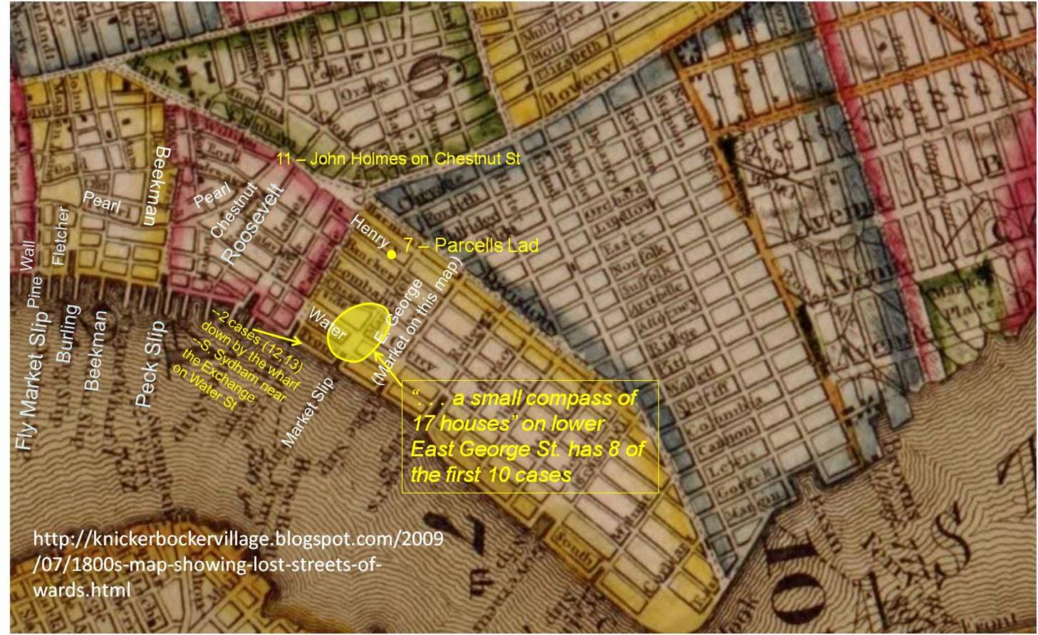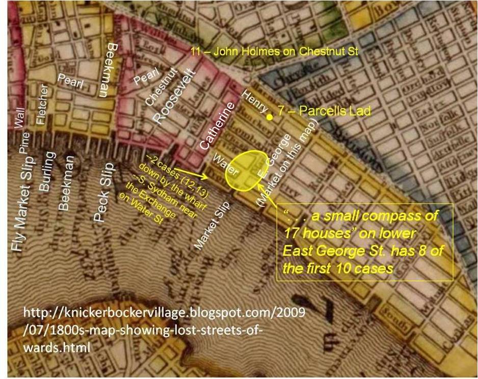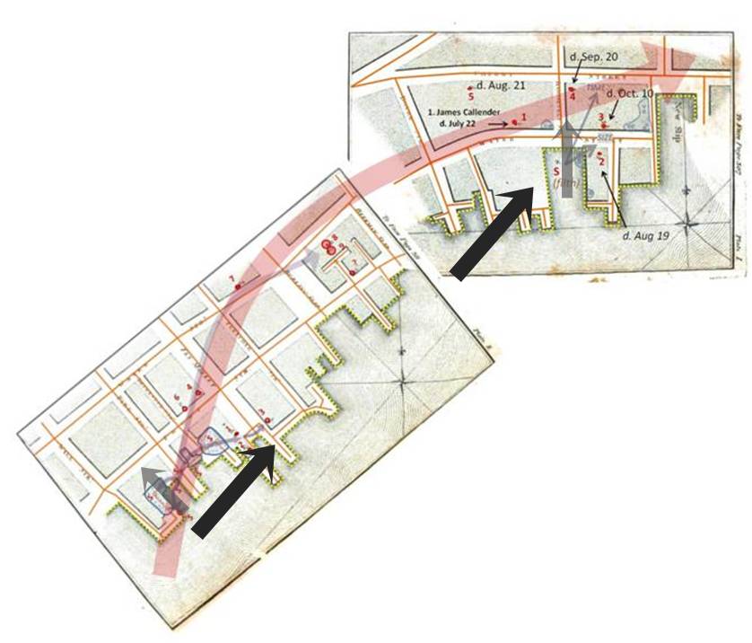 Seaman noted a cluster of homes close to Water Street with cases, several cases along George St and an isolated case on Chestnut St. The inferred diffusion pattern is fairly easy to reproduce based on Seaman’s writings. It leaves the slip and then follows the roadway, flowing between the buildings. This effect of the buildings is a common themes that recurs for the next several decades in disease maps. This route and behavior adheres to the “natural laws” (laws of physics) for the time regarding airflow and is therefore applied to diffusion processes as well. The isolated case of John Holmes, even in Seaman’s text, is suggested to be a case resulting from exposure close to the water edge, where the cluster of cases is noted “on lower East George St.”