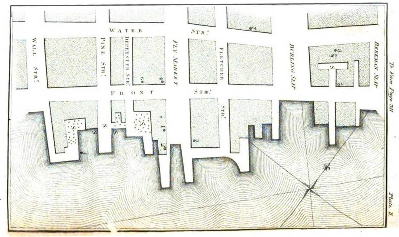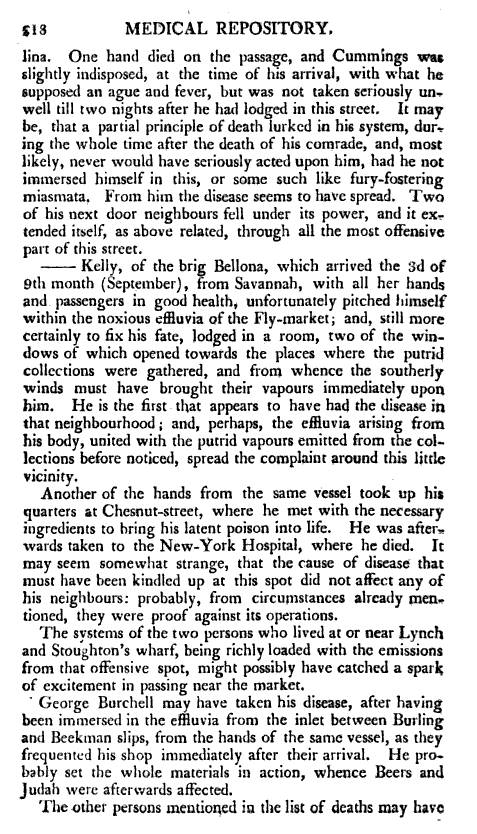 Valentine Seaman is one of the first to engage in such a detailed observation of an epidemic disease making its way into a city population setting. The unique layout of this region made it possible for Seaman to draw comparisons previously undocumented by epidemic researchers focused on climate and topography. The way in which the lower end of Manhattan Island was developed and used made it possible for some very information maps to be developed and used to prove the theory that this disease was due to some sort of human activity related to the formation of unhealthy areas saturated with human waste, effluvium. Together these forms the miasma needed for the disease to spread from the water’s edge onto the mainland and into the nearby communities of this well settled part of New York.