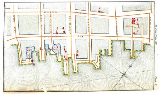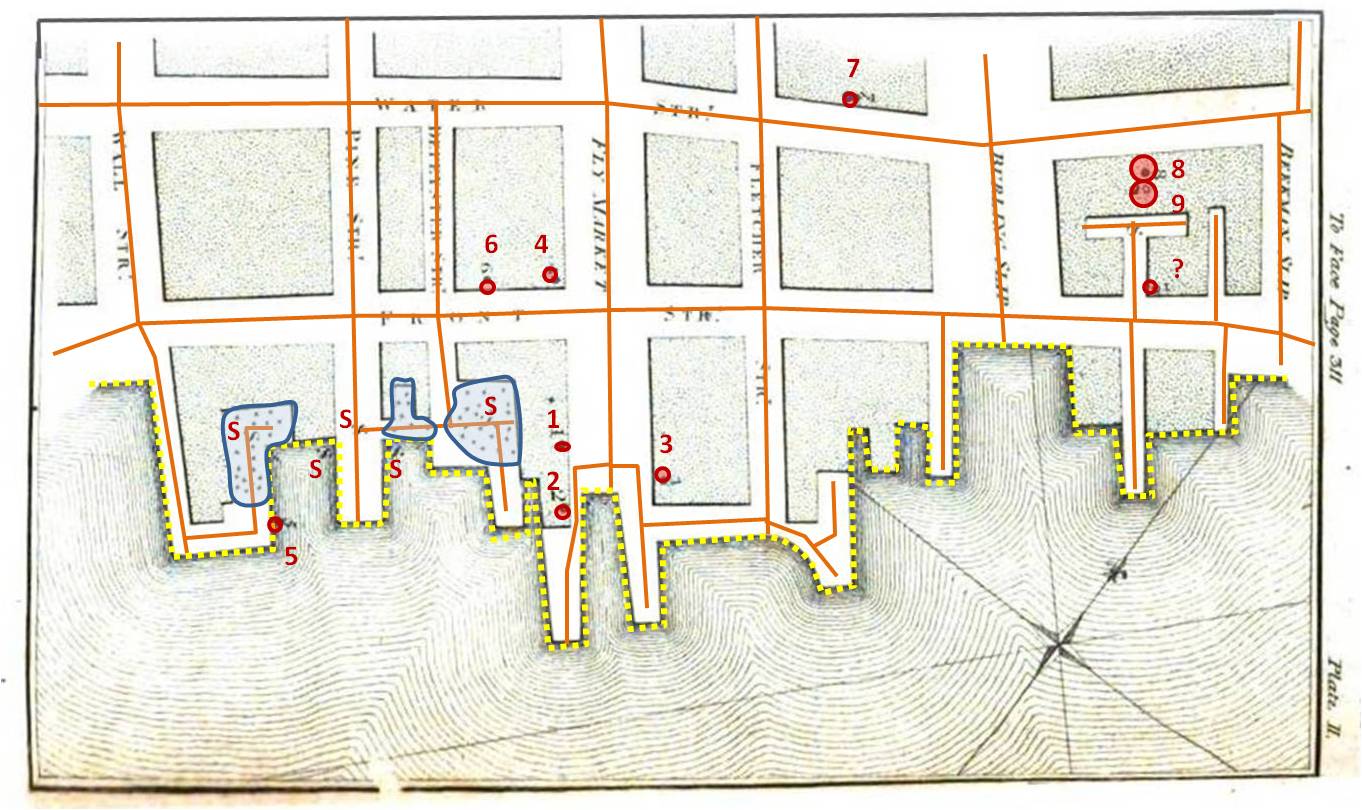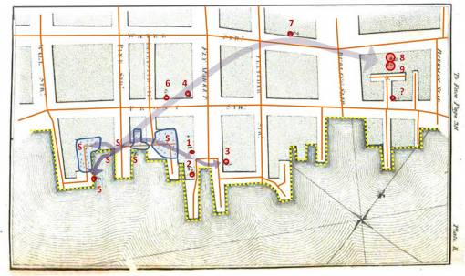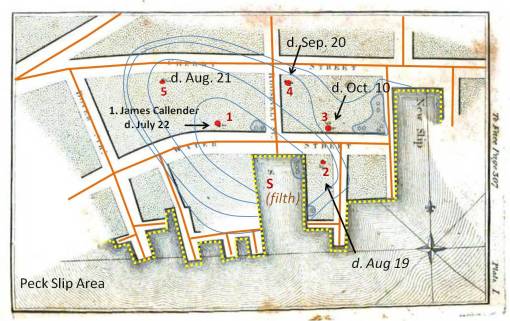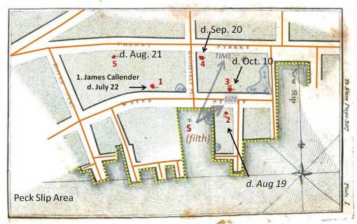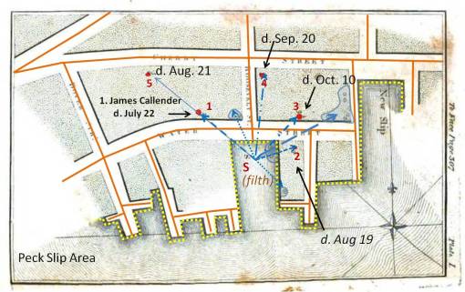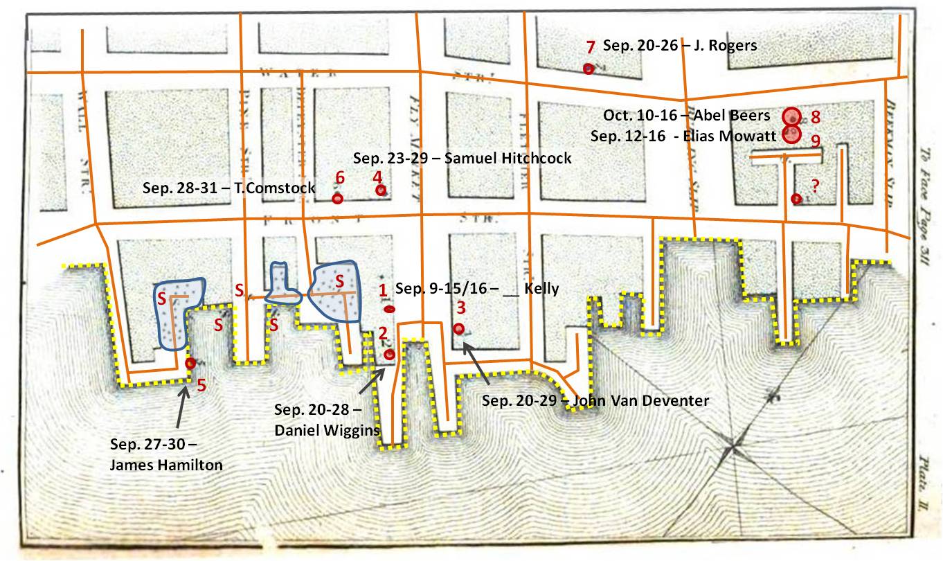 Unlike the first map, these combined fatal cases and case clusters or aggregates occur much closer to the water edge. Several of the slips were severely putrid, and are themselves aggregated around the individual cases and case clusters. The sequence of cases suggests a migratory pattern for the miasma: inward along Pine St and along Front St. following the Slips. Logically, the further away an individual is from the nidus, the longer it took for the cases to erupt.