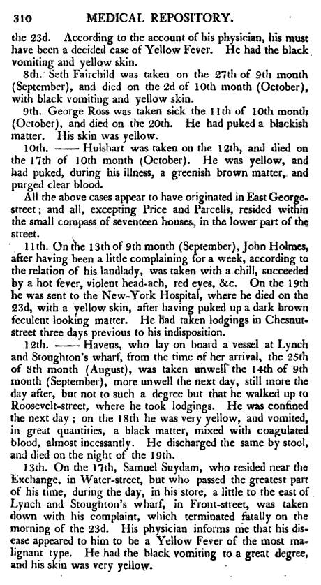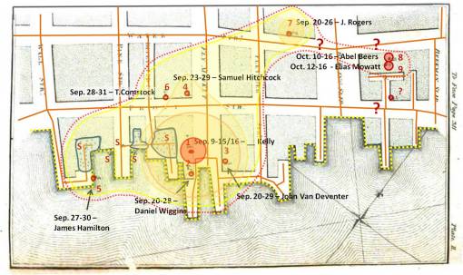 The dates for these cases provide further insights into the progress of the epidemic. On September 9th, day 1 ensued. This was followed by a lull, which lasted until September 20th. In contemporary 19th century terms, this was possibly due to the need for miasma to be produced. Either the climate was not supportive of putrefaction, or the amount of filth in the slips still had to undergo decay. September 20th is a peak day and marks the onset of a second wave of cases. Nowadays, we might theorize this is due to the biological nature of this disease. Mosquito breeding habits occur in cycles and are very much rainfall dependent. But back between 1795-1800, the mosquito was never shown to be related to this epidemic. Another explanation for this delay between cases pertains to the use of slip by ships and tidal flower patterns. The slips periodically fill and empty in this setting. It was the exposure of decaying debris that was felt to expose the worst putrid materials and therefore produce the most disease-ridden miasma.