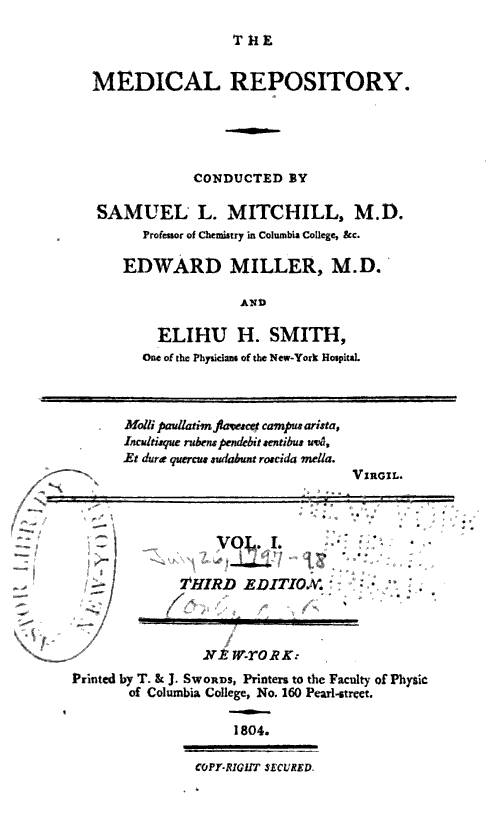 Valentine Seaman’s work on the Black Plague or Yellow Fever was initiated soon after the first epidemic struck Philadelphia in 1793. Benjamin Rush published his essay of the possible cause for this new epidemic in 1793. Valentine Seaman and many other physicians in New York City disputed Rush’s claims that this disease was imported and of foreign origins.