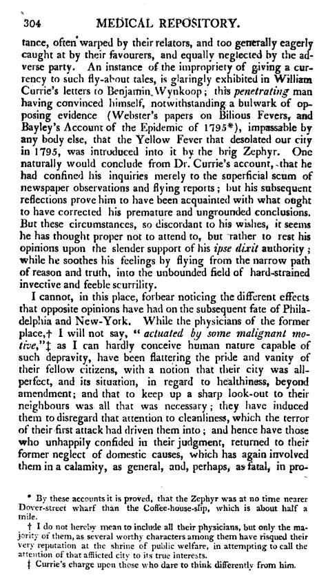 I should mention, you are the expert in this part of the Yellow Fever history. I would be interested to hear what you thought about the ongoing battle of who was right between PA’s Benjamin Rush and NY’s Samuel Mitchell. I don’t place Rush very high on a pedestal, due to the culture of his philosophy and upbringing. (I am NY so I am pro-Dutch and pro-Mitchell thinking; Rush was too British-American therefore.) I agree that Rush was pretty much convinced of the foreign born nature of the yellow fever, but his willingness to concede to others at times about possible local causes makes one wonder if he was really any different or special when compared with everyone else. My take on Rush is that he was like others, changing his mind at times with new information. Mitchell had some amusing theories for disease as well–Rush said the coffee went bad, Mitchell said there was this yet to be documented atomic substance septon, and a few other materials he made up names for as well (a lot of ego there). For yellow fever, there were local cases developing, so once the vector or virus finds a temporary home in the port areas, you could say coffee grounds, septon or ballast water was the cause–no one was really more wrong than others in their conclusions, they were just never right. And remember, some of the articles for that time (ca. 1793-1800) do mention “muskeetos”, but don’t lay the blame on just these animalcules; they are just one of several possible causes.