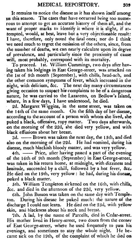 This disease seemed to many to be attached to the presence of ships, people, hot temperatures, and putrid air and water, in particular within crowded population settings such as large towns and cities. Since each of the fatal cases could be mapped, their possible causes could be related to each case. This is what Valentine Seaman did around 1794 or 1795 (in the copyright page of these early book, even Governor Clinton noted the importance of maps in defining diseases and other important features of the young United States, and so included maps in his copyright notice found in every book published in upcoming years.).