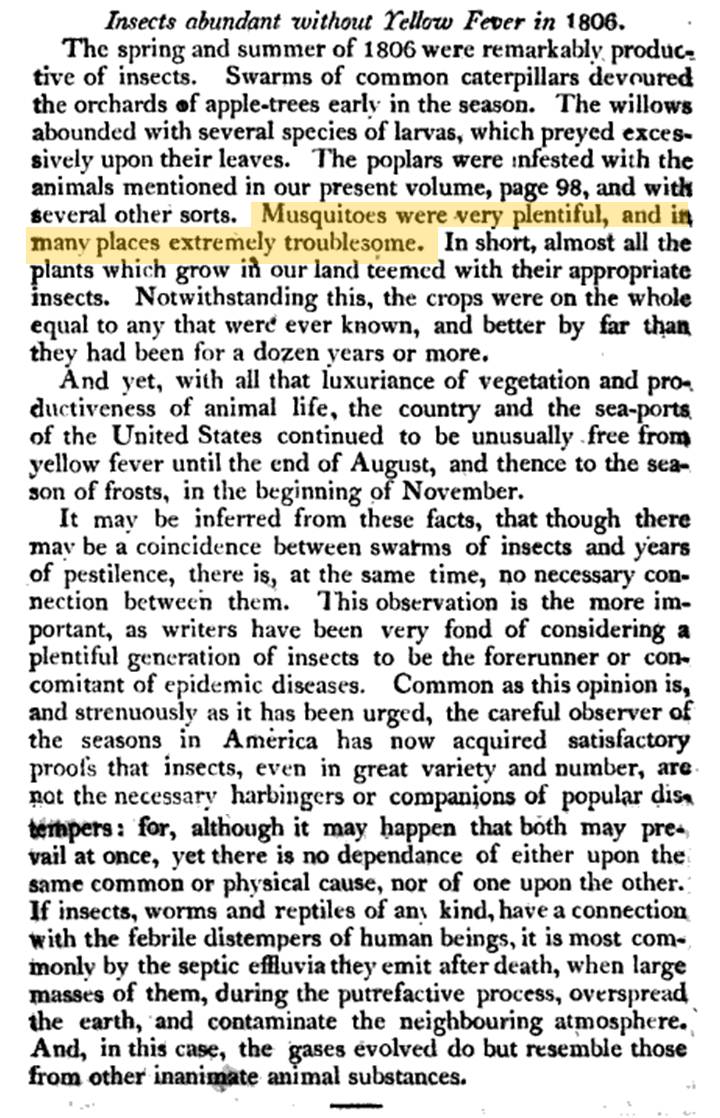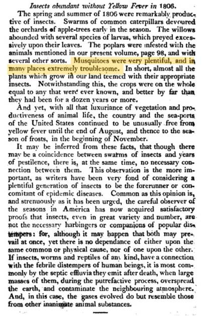 Neither Seaman, Rush or any of the comrades of these two doctors in the large cities were ever able to define the original source and cause for this disease-causing contagion or miasma. The mosquito was the cause, but that would take another century for scientists to prove. They eliminated the mosquito from their list of possible means for spread due to the lack of similar diffusion processes involving other animals and animalcules species. The assumption then was that if mosquitoes could carry the disease on its body, then so too could the common fly and other commonly swarming pests. Pests were pretty much ruled out extremely early and never really allowed to return as a possible cause. Two people (reviewed elsewhere) however did consider the “muskeeto” as a possible pathogen–Samuel Mitchell noted this possibility in passing, as well as a Ship Surgeon following the second series of yellow fever epidemic years.