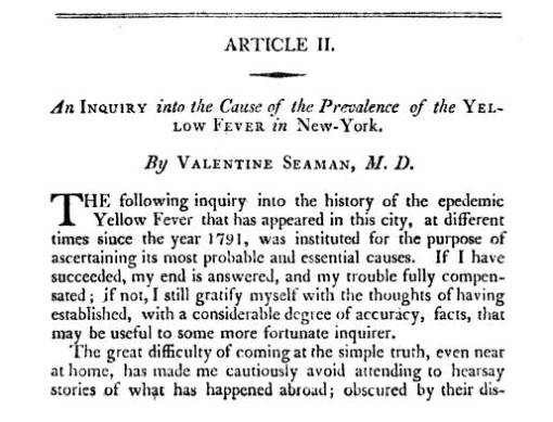 Valentine Seaman, 1797 (1804) – the Black Plague or Yellow Fever of New York City » 1804_MedicalRepository_vol1_no3_ValentineSeaman_YellowFeverinNY_p303