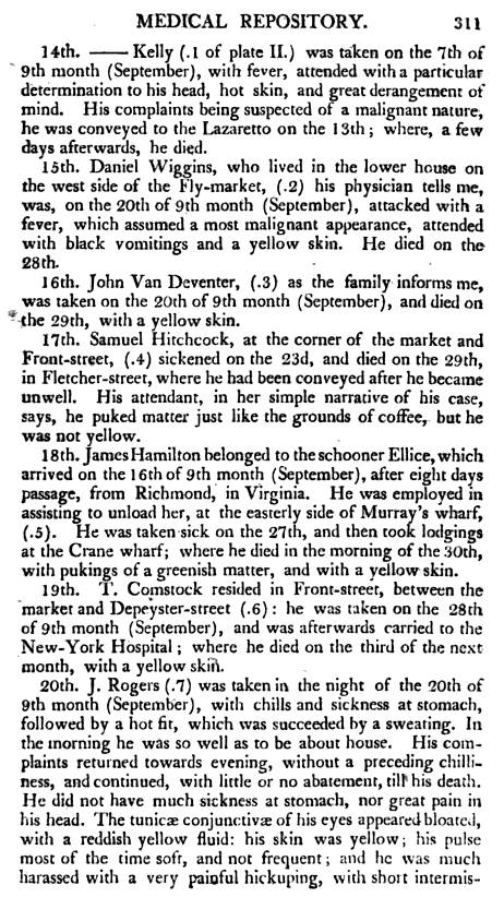 Valentine Seaman, 1797 (1804) – the Black Plague or Yellow Fever of New York City » 1804_MedicalRepository_vol1_no3_ValentineSeaman_YellowFeverinNY_p311