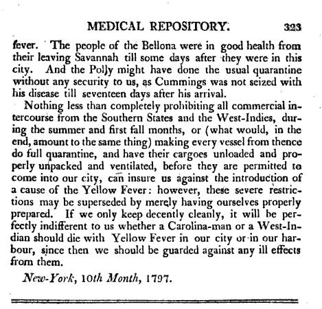Valentine Seaman, 1797 (1804) – the Black Plague or Yellow Fever of New York City » 1804_MedicalRepository_vol1_no3_ValentineSeaman_YellowFeverinNY_p323