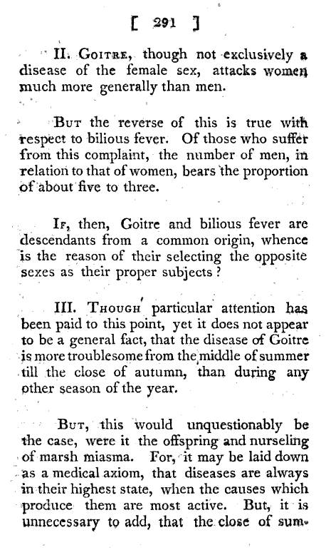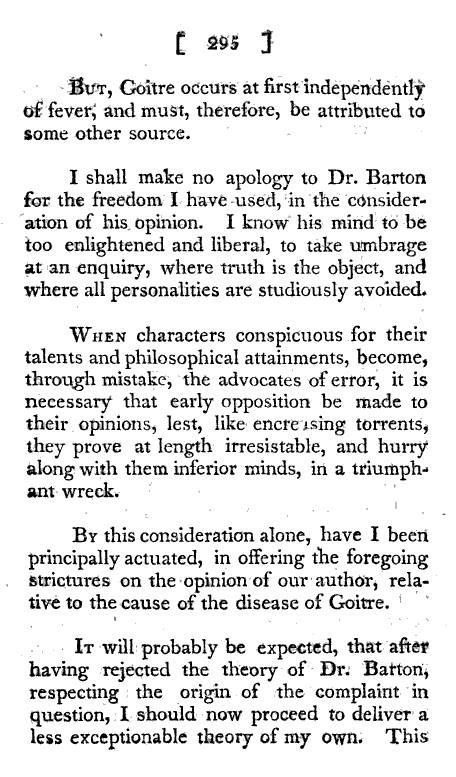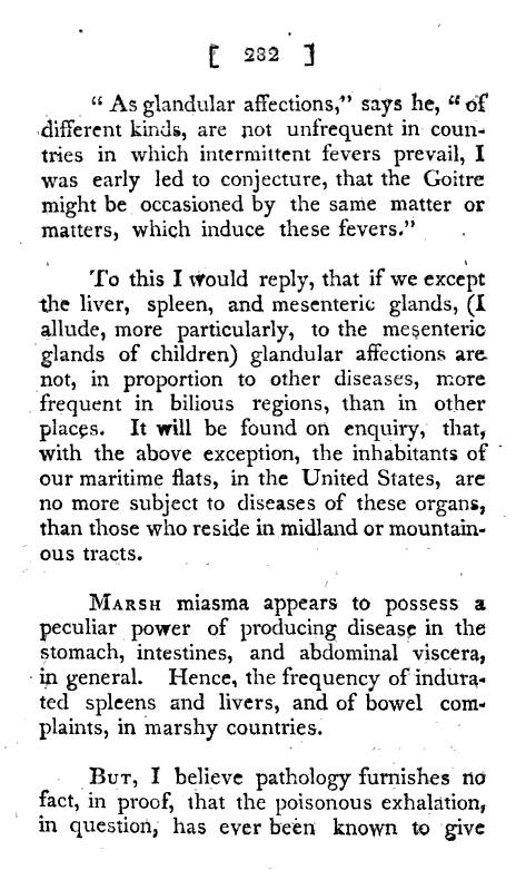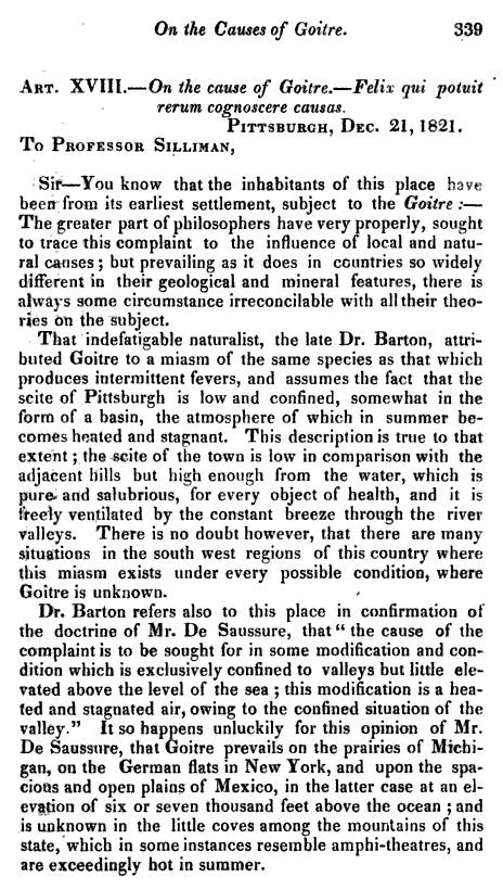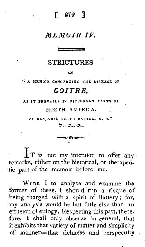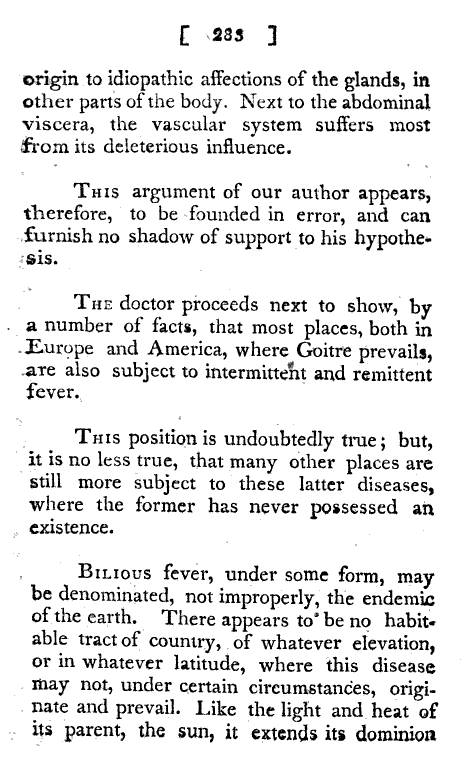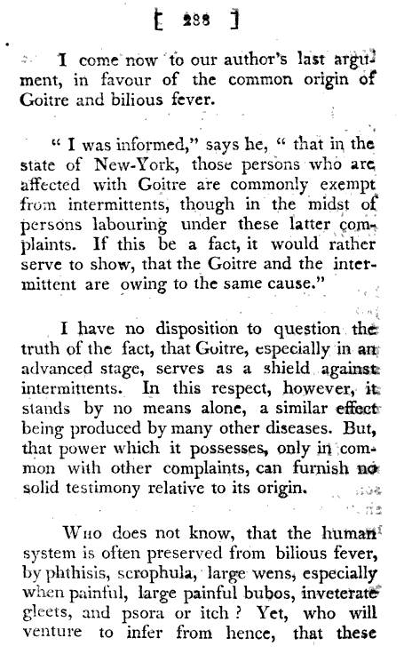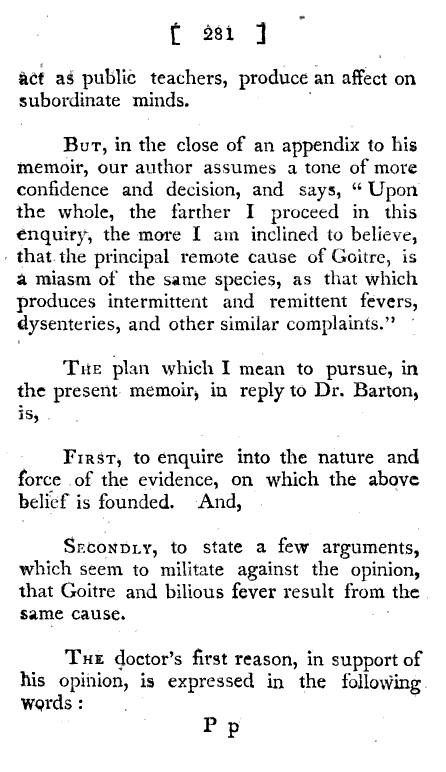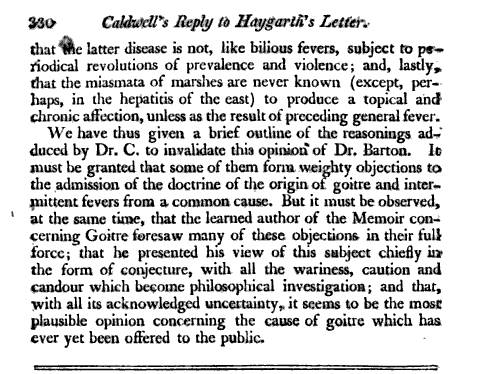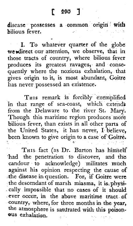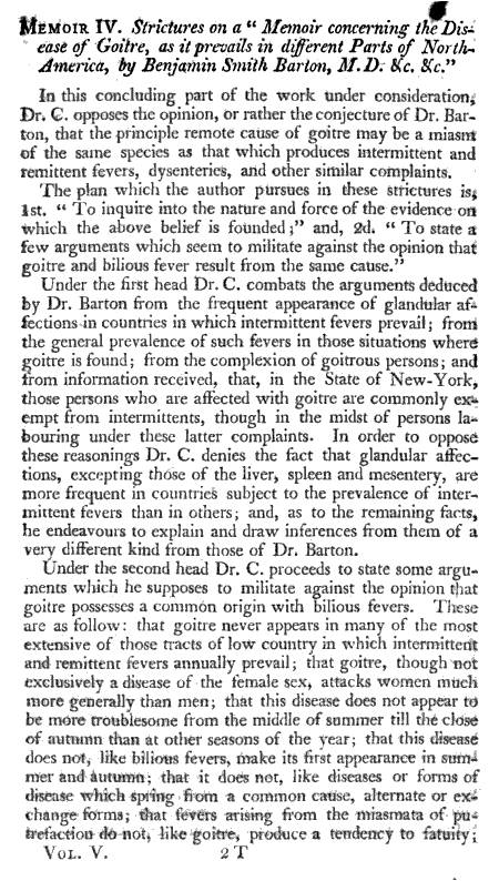 “Dr. C. opposes the opinion, or rather the conjecture of Dr. Barton, that the principle remote cause of goiter may be a miasm of the same species as that which produced intermittent and remittent fevers, dysenteries, and other similar complaints.”