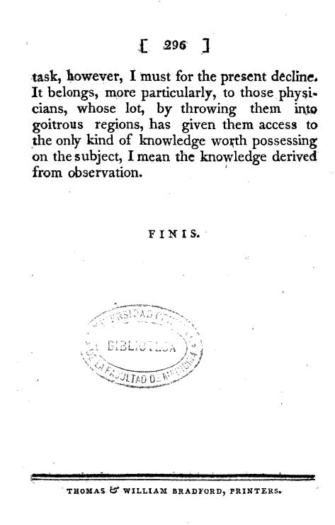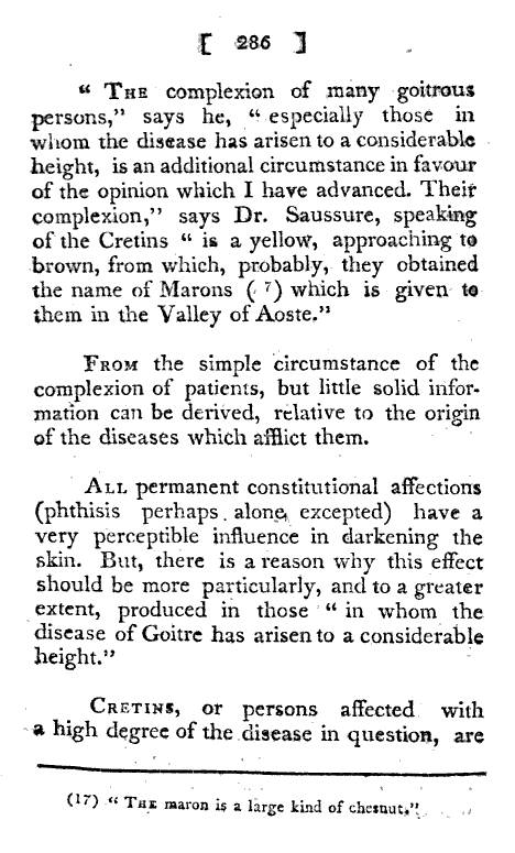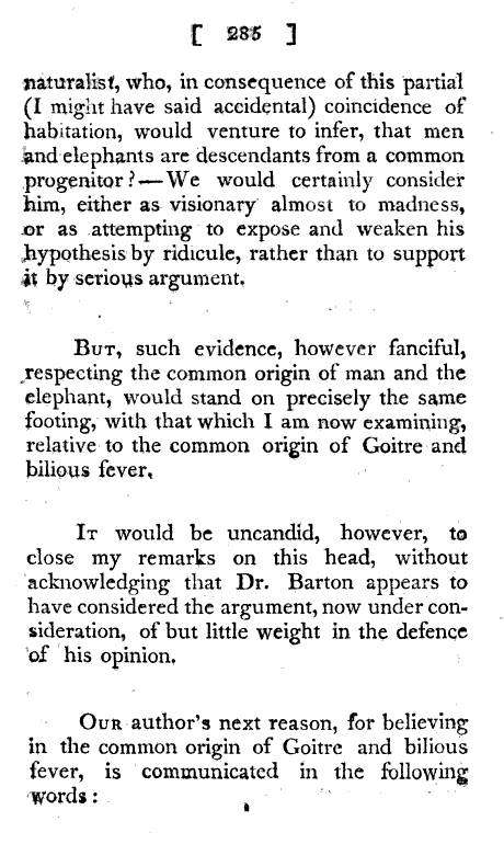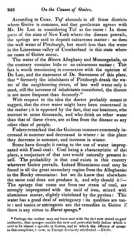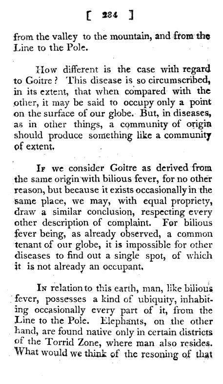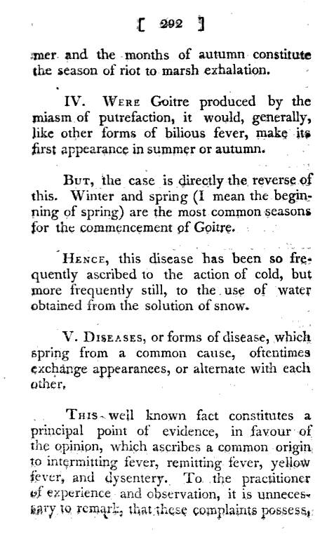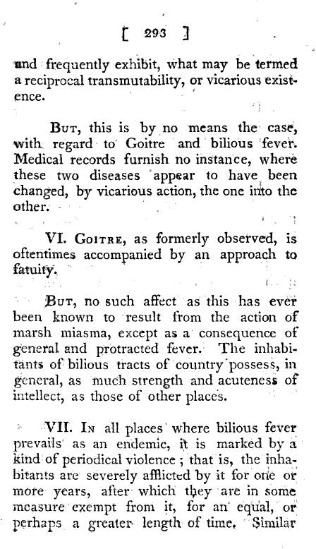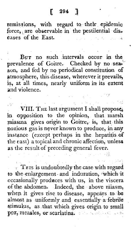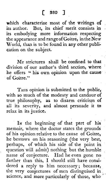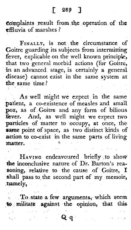 “Dr. C. opposes the opinion, or rather the conjecture of Dr. Barton, that the principle remote cause of goiter may be a miasm of the same species as that which produced intermittent and remittent fevers, dysenteries, and other similar complaints.”