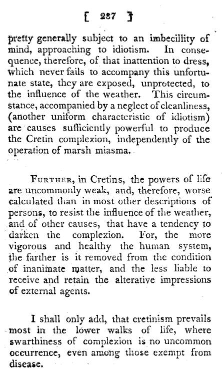 It is always easy in the field of medical topography or climatology to come up with speculative theories about disease, and the more detached a doctor and/or writer is trying to explain these diseases, the imaginative he or she can become. Such is the case again regarding Barton versus Caldwell’s experiences. Caldwell probably saw the cases first hand as they first became visible and evolved into their most unhealthy physically deformed states. Barton, seeing these people less often, may well have seen early and late examples, had less a sense of chronology about the rate of development of this disease, and so provides explanations that seem more aggressive, more capable of demonstrating the impacts of a hostile environment, than those of Caldwell.