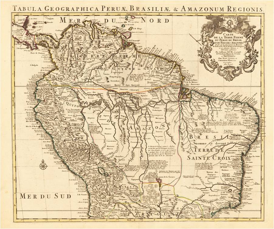 Tabula Geographica Peruae, Brasiliae & Amazonum Regionis. Carte de la Terre Ferme Du Perou, Du Bresil et du Pays Des Amazones. Dressee sur les Descriptions de Herrera de Laet, et des PP. d’Acuna, et M. Rodriguez, et sur plusiers Relations et Oberservations posterieures Par Guillaume Del’ Isle, Geographe de l’ Academie Royale des Sciences. Amsterdam, Covens, I. & Mortier, C. 1755.