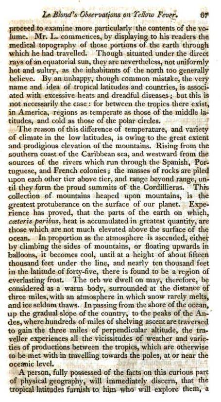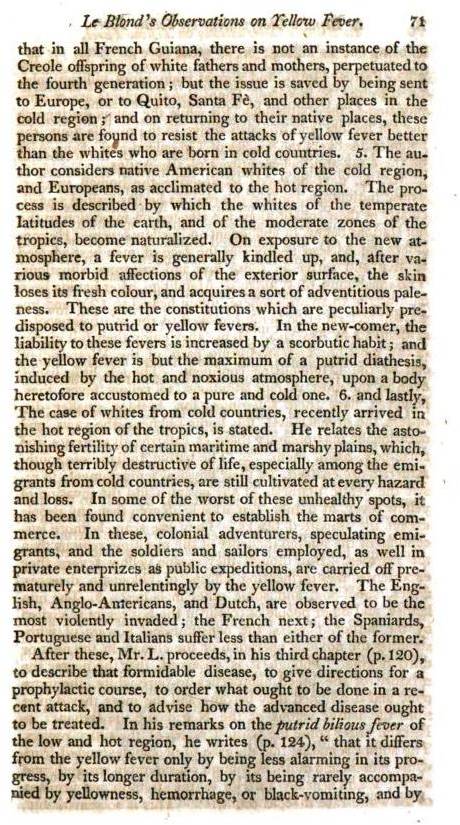 Yellow Fever is the first epidemic disease pattern to be documented which had both global and zonal characteristics used to explain its migration behavior and its tendency to form diseases nests or niduses. This disease penetrated communities in both hemispheres, and was directly associated with specific coastline oceanic topographic, climatically-defined port regions located between specific latitudes and temperature-defined settings. Jean Baptiste Leblond is well aware of this spatial association of disease and the environment due to the numerous travels he engaged in over the decades. A descendant of a highly respected family linked to the design and development of Paris, and the establishment of the immense Garden of Paris , he had the opportunities needed to observe and study yellow fever behavior in relation to shipping routes and ports. This book summarizes his findings during these years. Due to the French Revolution and the subsequent migration of French Scholar to the United States, the philosophy provided became the main impetus for the development of a medical geographic perspective on disease in the New York setting by the beginning of the 19th century. The primary initiator of this new way of observing and studying disease in the United States was Samuel Mitchell, a naturalist and physician with an interest in fossils, geology, and any other natural history feature possibly related to disease patterns.