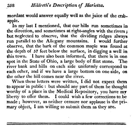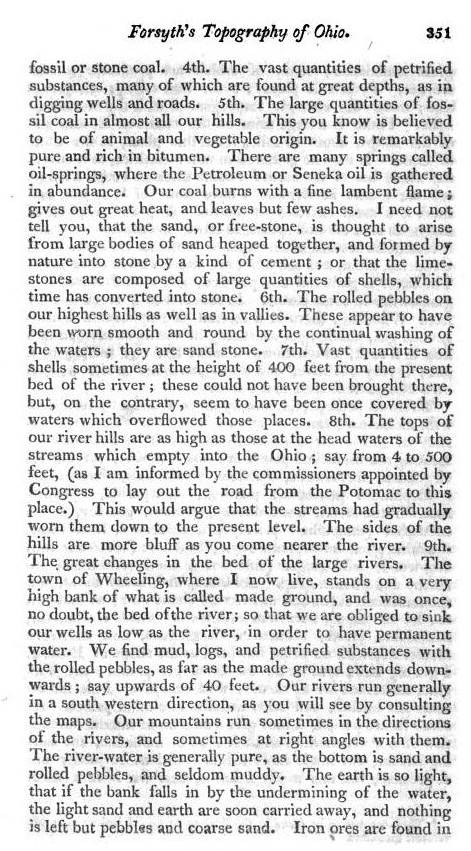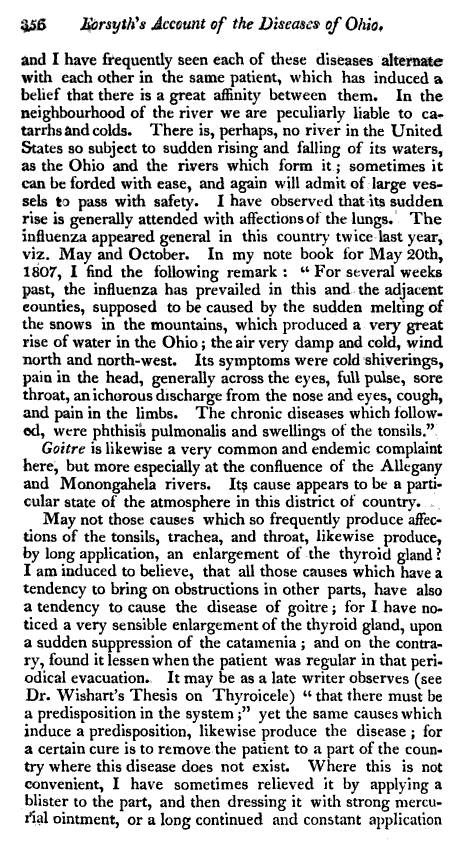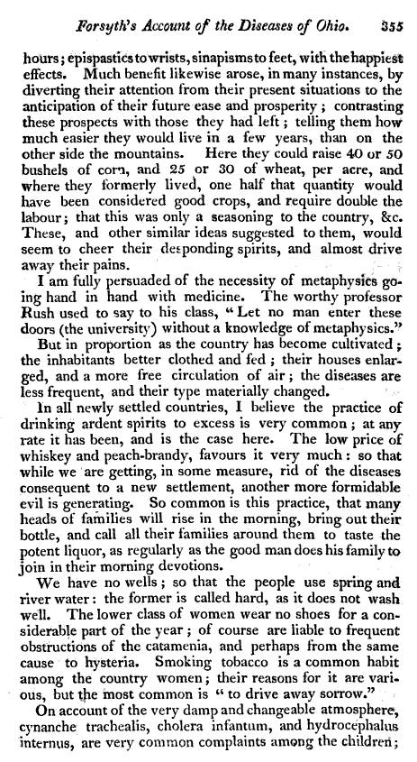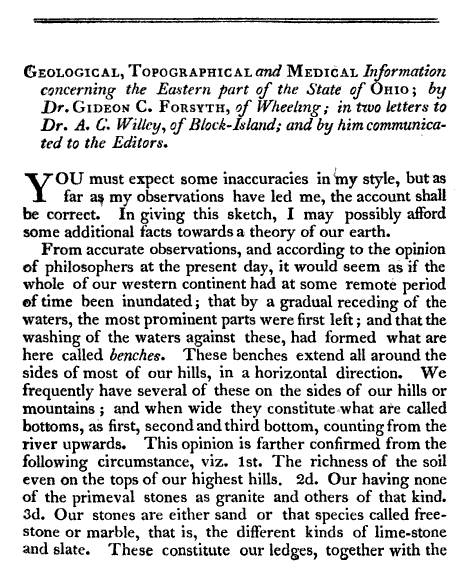Nevertheless, Forsyth provides us with a description of the medical topography of Ohio around his place of residency in the town of Wheeling. The topics he reviews are typical for a complete medical geography, with the addition of a few facts and their related details regarding this region that are somewhat unusual for this type of regional reviews. In particular, aside from the expected coverage on local topography, geology, botany, medical botany, and zoology, we find a little more emphasis on indigenous history, due more than likely to their proximity to many of the new colonies and settlements being established in this part of the United States.