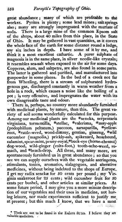 Like other authors, Forsyth also mentions the numerous medicinal plants of the region. Some highly important medicinal plants are noted such as seneca and virginia snakeroots (polygala senega and aristolochia serpentaria), ginseng (the American ginseng panax trifolium), american mayapple (Podophyllum peltatum) and puccoon (bloodroot, Sanguinaria canadense), valeriana (perhaps Valeriana spp. or close relative; Thomsonian trained individual would just a few years later have this genus name totally mixed up with other species and genera) and yellow-root or goldenseal (Hydrastis canadensis). The abundant supply of goldenseal is interesting to note. Since the late 19th century, this plant became nearly extinct in a number of midwestern states, following in the footsteps of the highly popular American ginseng overharvested for trade with the Orient during the later colonial period of American history.