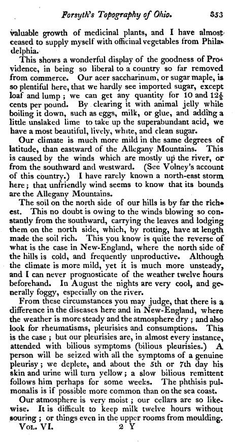 Forsyth makes his most interesting statement when he compares the weather from where he lives with the weather in New England. New England weather he confirms has a shoreline effect upon climate–the climate is less volatile in terms of seasonal temperature changes. Forsyth also states that in New England “the weather is more steady”. However, he also states that the atmosphere of New England is “more dry” and like that of Ohio. More than likely, some of his readers disagreed with this statement, stating that lakeside, valley and oceanside settings tend to have a more humid atmosphere, as humid as if not more than that of Ohio. In New England, even regions located a considerable distance inland from these hydrologic features are expected to be more befitting of this statement by Forsyth, that part of New England he is probably referring to with this statement.