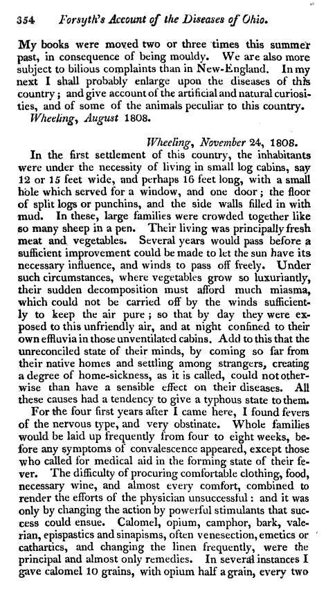 The most important part of Forsyth’s writing pertains to medical climatology and topography. The climate description of the Ohio setting he provided gives us important insights into how medical topographers and geographers came to a better understanding of regional disease patterns. Just ten years prior, there were two very popular theories about the migration behavior of disease. The contagion theory stated that diseases were produced by the human body and required some sort of close proximity and direct relationship between the unhealthy and the healthy in order for the latter to become ill. The opposing theory for contagion, the miasma theory, state that some substance was generated in nature or by an ill body that could be spread and dispersed by air flow, the diffusion of which related to wind speeds and directions.