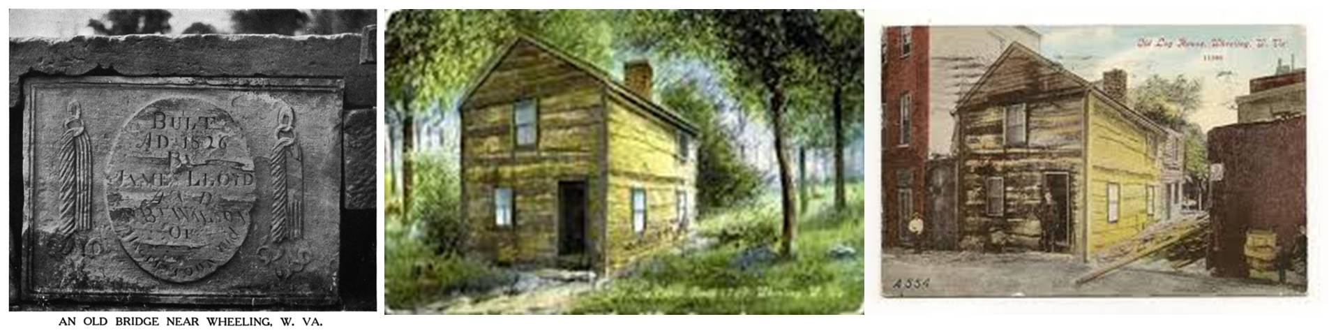Wheeling artifacts and buildings: Cumberland Road dedication ca. 1817-8, Old Log Cabin derivative 1825-35,within the town proper ca. 1860