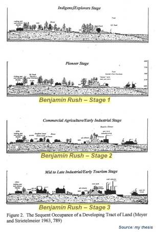 Forsyth’s second letter applies Rush’s terminology and philosophy for defining the sequential lifestyles found within a given setting by applying it to the human population history of eastern Ohio. Forsyth uses Rush’s approach and terminology for interpreting the health of an area in relation to its settlers and stage in economic development. This makes Forsyth’s work a historically important example of Rush’s version of geography in relation to economy and lifestyle, and an example of reviewing regionalism and socioeconomic development using the sequent occupancy approach.