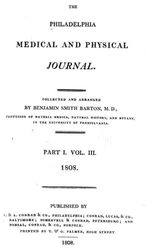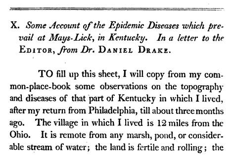 With attention more focused by the time the second such epidemic struck Philadelphia, and this time most certainly New York City, physicians and others were ready and alert to the numerous potential causes out there for this severely bad example of fevers. Like many writers, Daniel Drake mentioned a number of possible observations that he felt were related to the yellow fever that struck May’s Lick, Kentucky in 1807. He does not treat the inland epidemic in Kentucky as if it were the yellow fever epidemic. Were he familiar with the writings on Lake fever by Watkins of New York, then he most certainly could have included this “diagnosis” of the fever type in his essay. Fortunately and unfortunately, he does not.