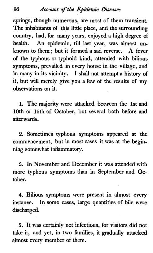 Daniel Drake writes about a form of “typhous” or “typhoid” fever with “bilious symptoms.” For the time, no distinction between typhoid (mosquitoes) and typhus (mice and rats) was known, and would not be even partially understood for decades to come. Drake notes the period when this fever struck as October “10th or 15th”. Could geography and the definition of disease zones on the earth be a reason for Drake’s conclusions and hesitancy to make an exact diagnosis?