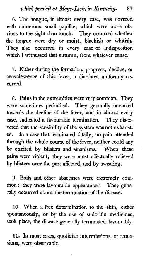 Were he living in Ohio, just a few minutes north of Kentucky in terms of latitude, then he might be residing in a state where yellow fever did prevail, due to the latitude in combination with the heavily travelled Ohio River. Moreover, this is the peak period for yellow fever epidemics to commence its continuous epidemic like pattern in places like Ohio. To the south it should have initiated two to four weeks earlier. But since this is still within the mid-Atlantic states region, this disease was considered to be now well into its period of time when it was expected to create havoc along shoreline and inland shipping routes. Such was not the case for Drake’s homestead setting, and so such was not the diagnosis for this May’s Lick Fever.