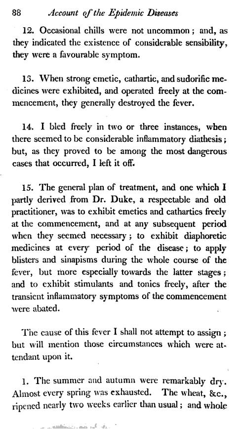 But as for cause and geographical reasons for this disease, Drake does take some cautious steps in drawing his conclusions. Drake rightfully includes the mention of insects as a possible cause for this mysterious and most deadly illness. In the mind of contemporary disease geographers for his time, he perhaps resided to far inland to be suceptible to the famous yellow fever with its roots in the Caribbean. Much of the blame for this and other fevers like Watkins’ “Lake Fever” are related more to local topography that to just the local plants or insecta. But Drake added a few more possible causes for these typhoid and swamp fevers.