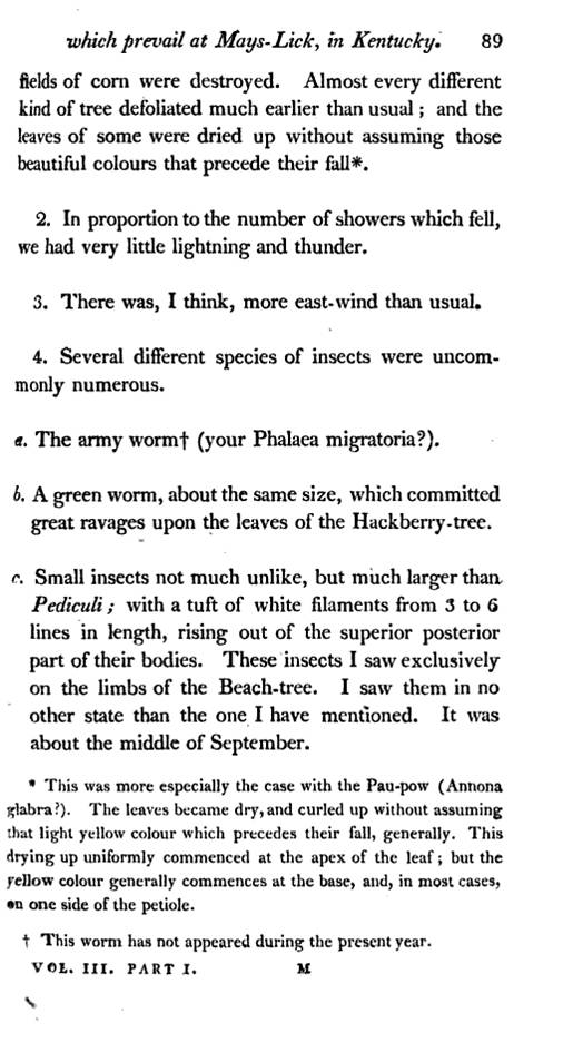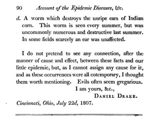 For this article, perhaps the most important part of this work begins on page 89, where Daniel Drake notes a number of insects as possible causes for the diseases striking his home town setting. He notes the “army worm (Phalaea migratoria?)” as an insect with possible relations to this disease, along with “Several species of abundant insests”, “a green worm” found on the Hackberry tree, “Small insects not much larger than, but much larger than Pediculi” on Beech Trees, and a worm that infects Indian corn. Mosquitoes were never mentioned. He also noted the east-wind and “the number of showers which fell.”