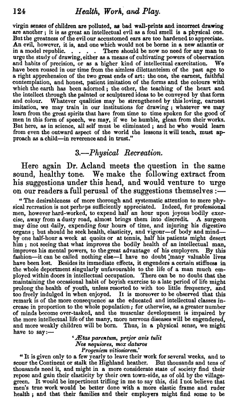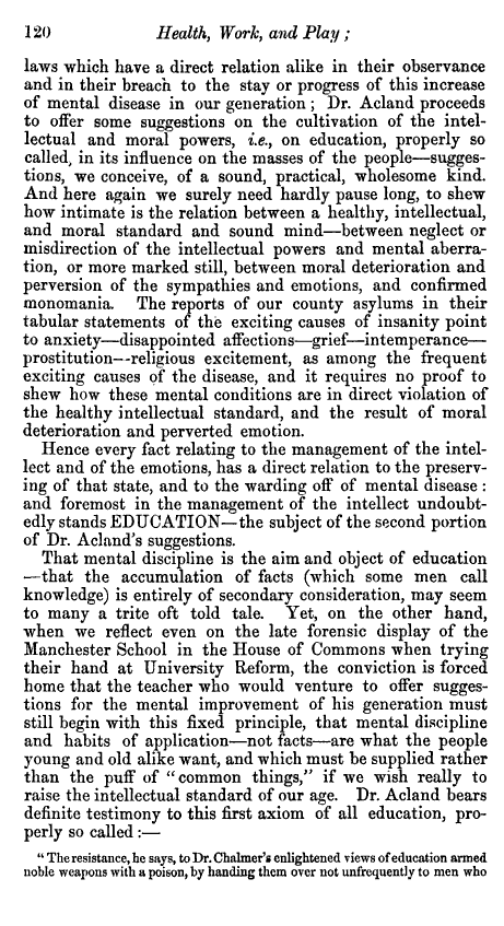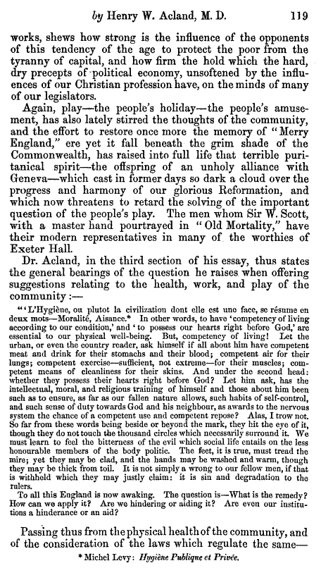 Perhaps the most important book ever written on the health of the poor during the mid-19th century was Health, Work and Play by Henry Acland, published in 1857. This book focused on the social inequality making its way through much of Great Britain during the first half of the nineteenth century, since the first major writing on this public health issue by Malthus in 1797 and republished several times more over the next ten years.