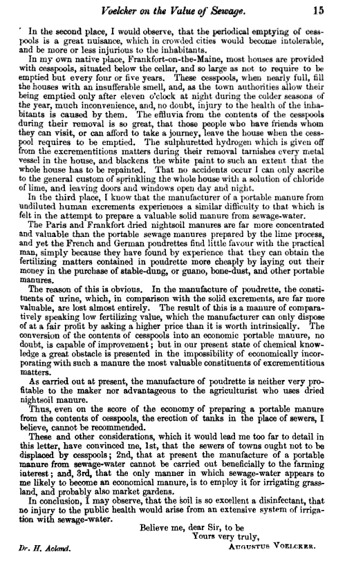 The nature of the sanitation problems at hand in the new systems design for treating human waste were defined well in this following letter written to Acland by Voelcker. The details about the usefulness of human waste, including urine, in industries and tasks related to gardening would come up repeated for decades to come as an important public health and waste management issue, with special qualities when it came to providing more cost effective processes to programs attempting to manage the issue of poverty and unhealthy living environments.
