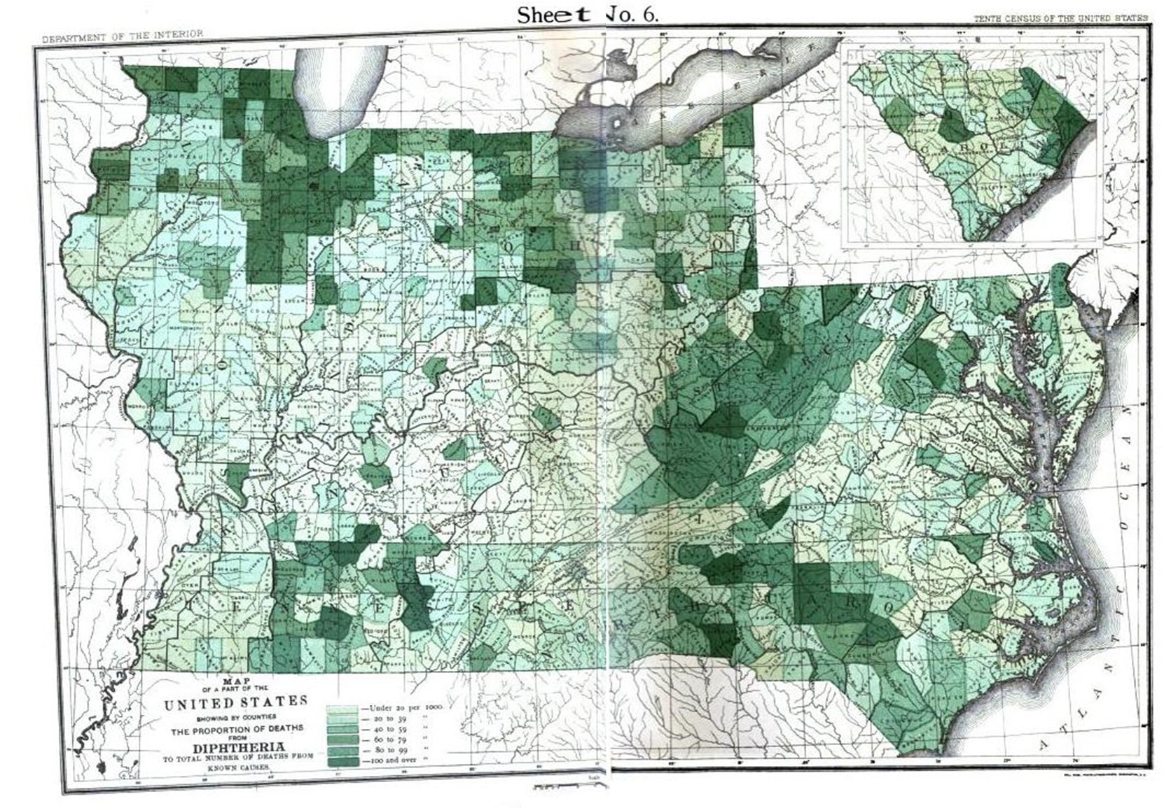 To put this 1890 census map of diphtheria into context, in particular the emphasis on county level data, the following information from Wikipedia is provided: