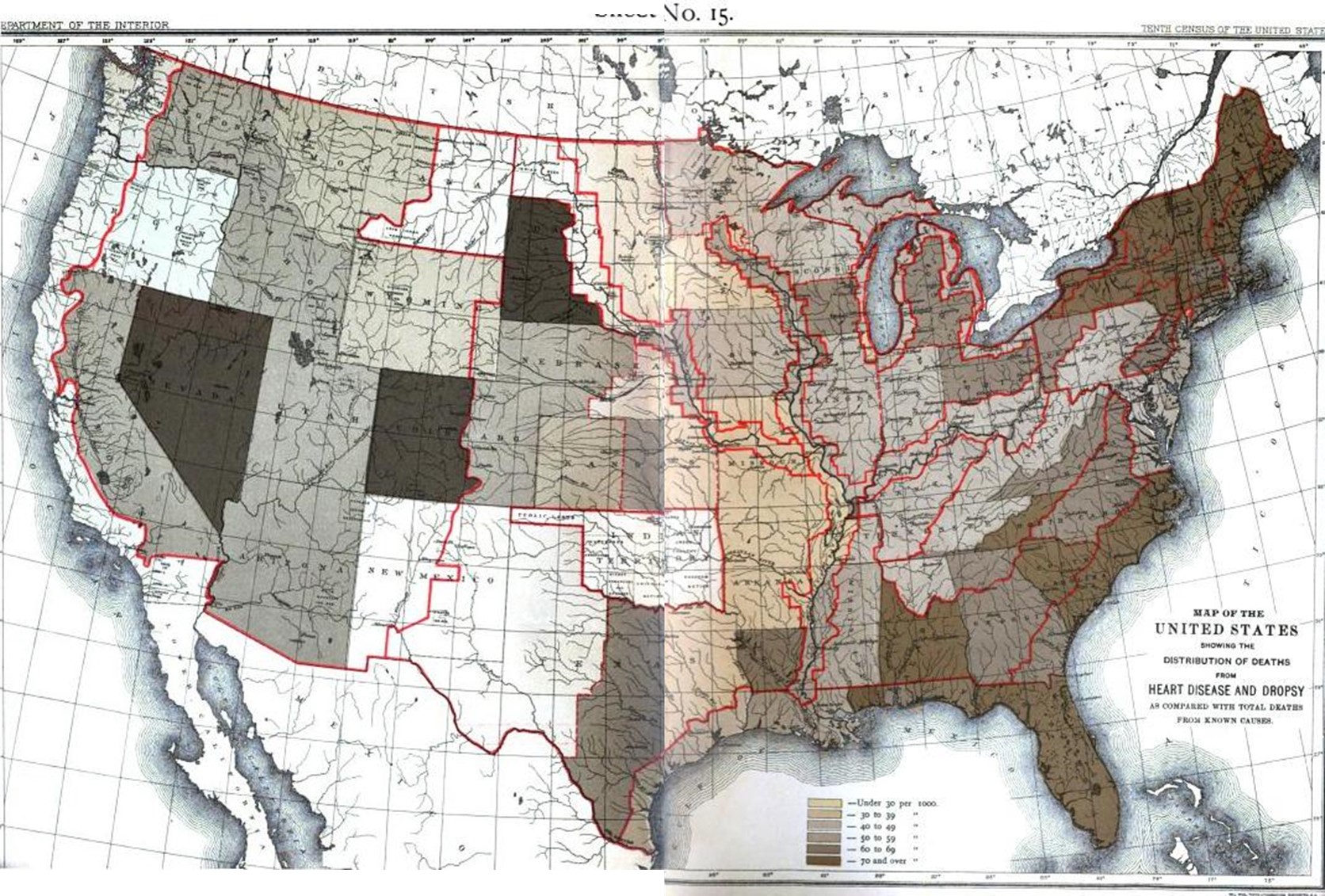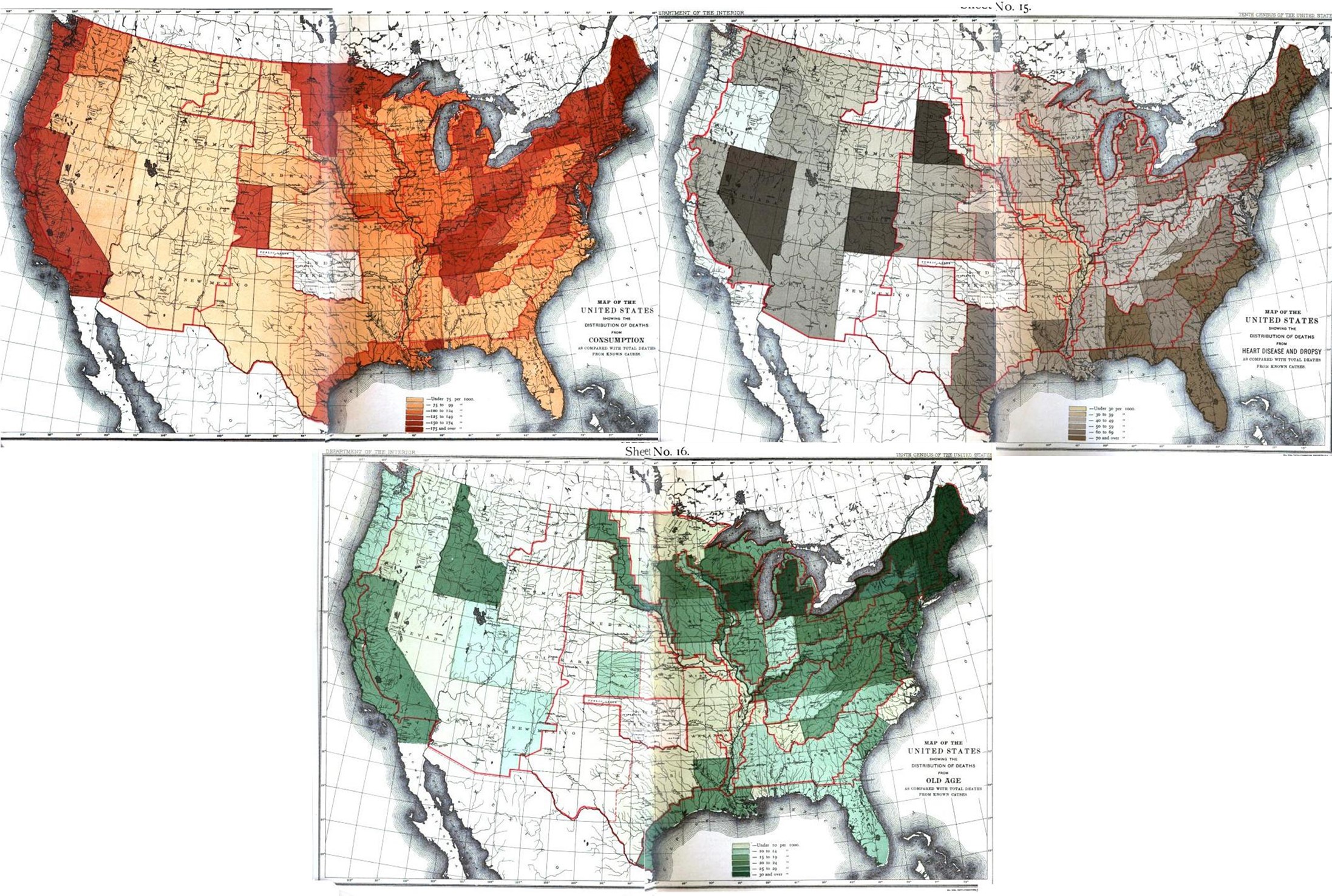 Upon first inspection of the above maps, we might think that heart disease, old age and consumption demonstrate potential aspect relationships, meaning one side of the mountains is influenced more or less than the other all along the entire mountain range. If we extend the mountain range through Pennsylvania to encompass the Allegheny plateau as well, followed by the Adirondack region, we can continue this argument.