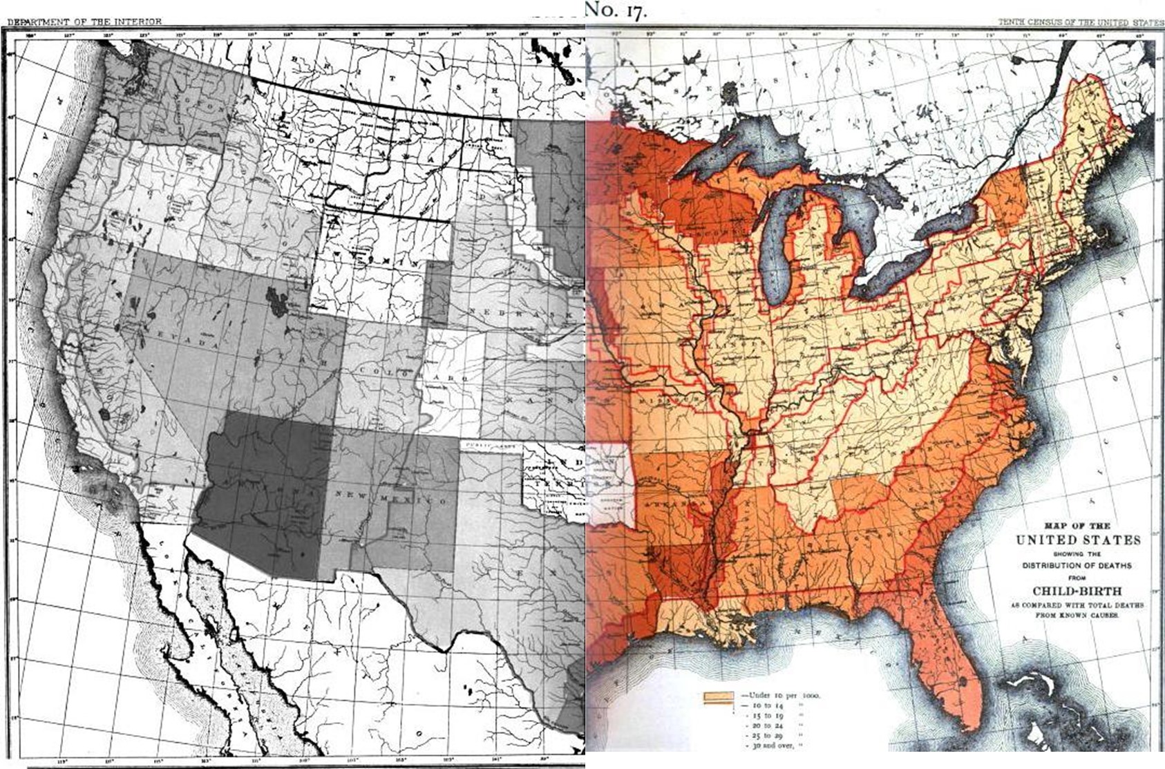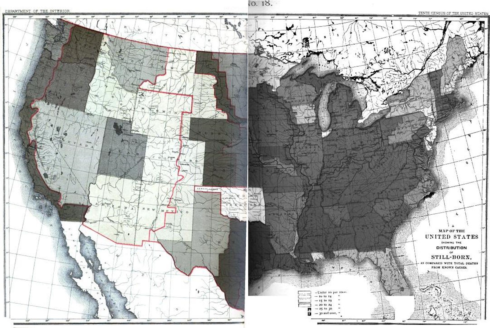 In the following pair of maps we see minimal regional differences across the research area, and in general, not much of a difference between neighboring places no where we go for stillborns. Only the lower New York and New Jersey, Delaware areas seem to be fairly well managed with still borns. Childbirths demonstrate and south-north difference in general, a finding that still exists to this day according to my national population health grid mapping project. The peak northwest to westnorthwest of the Great Lakes is also consistent with population grid findings. These are regions where child care back then, as with now, are still a relatively higher needs, higher costs group for this country in general.