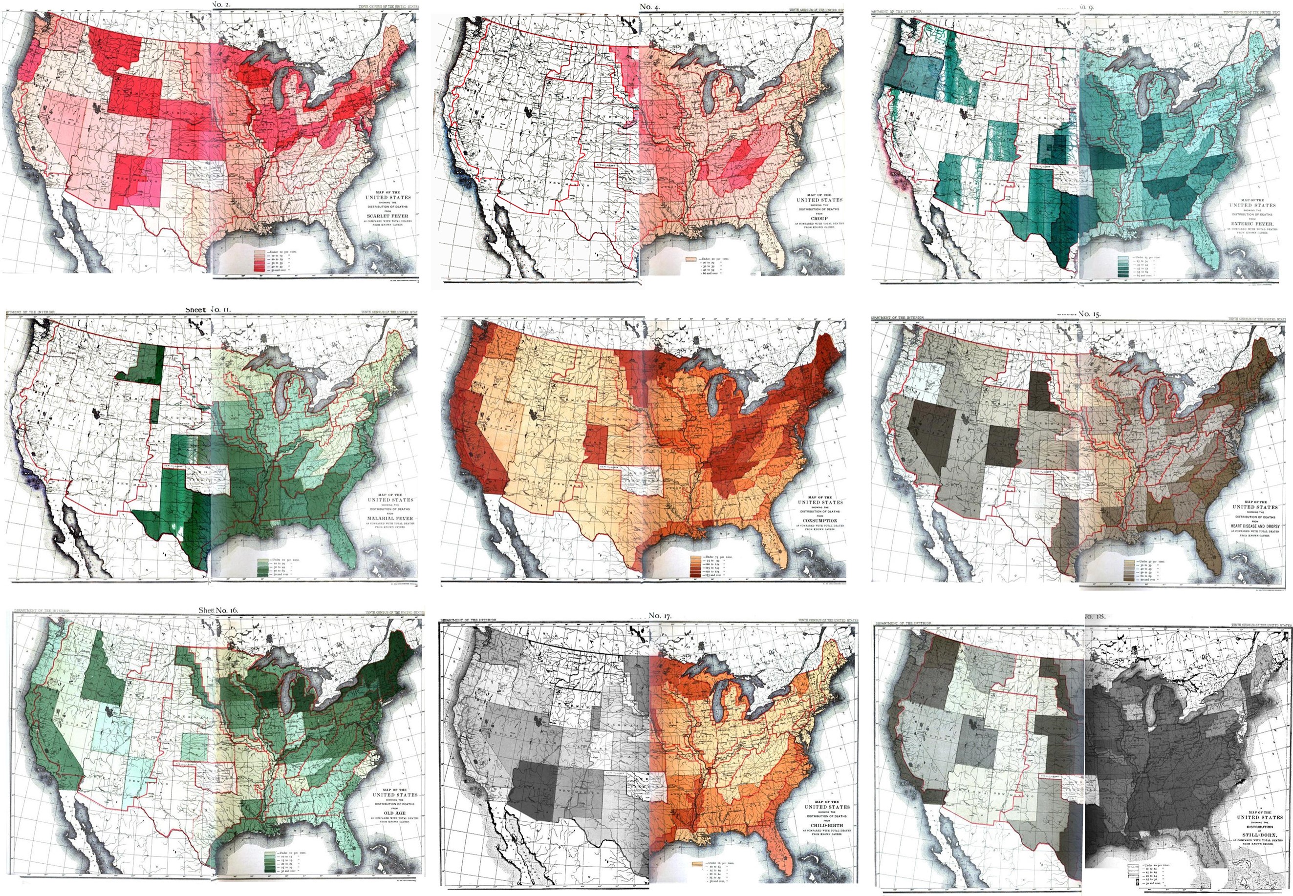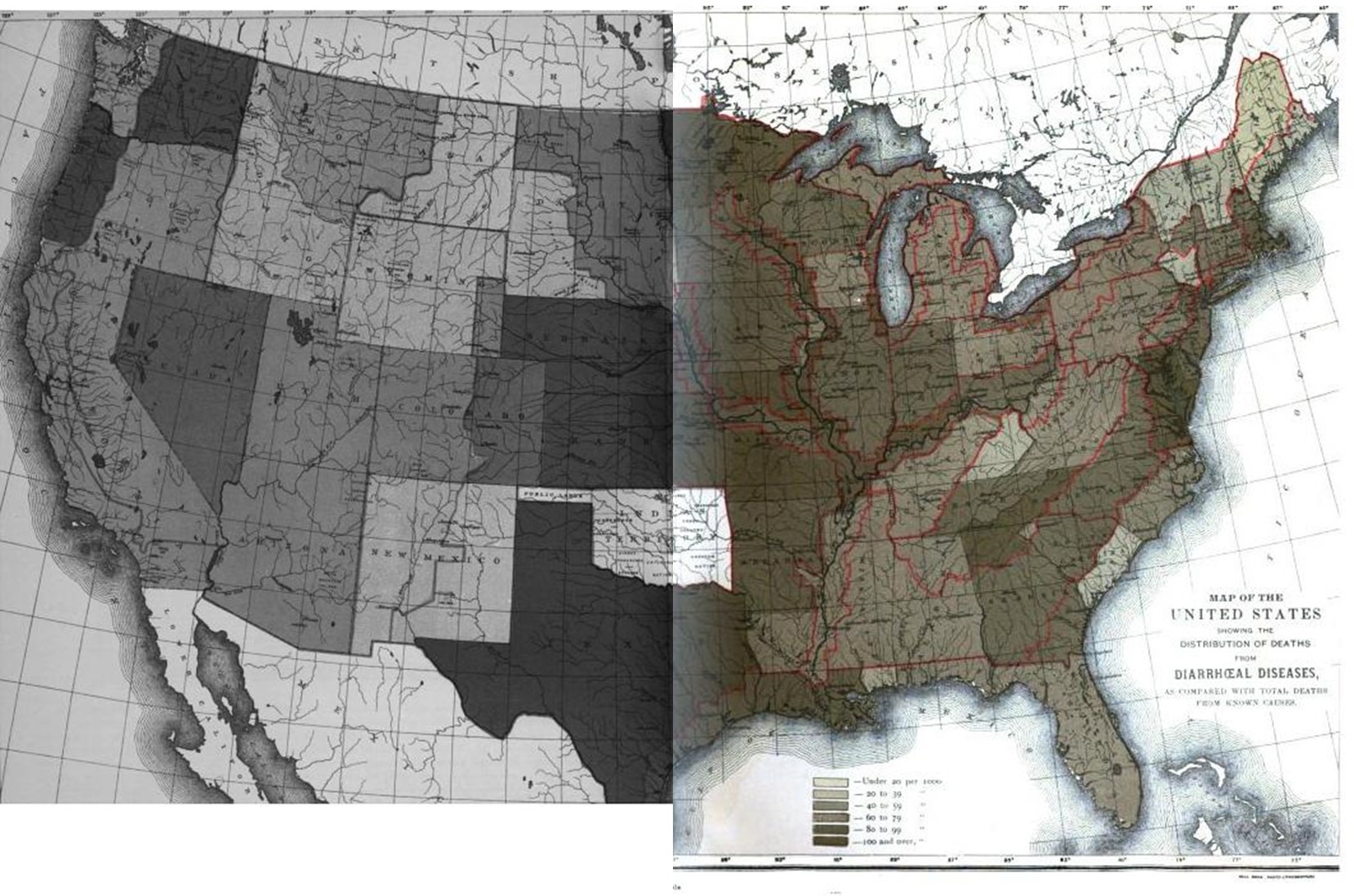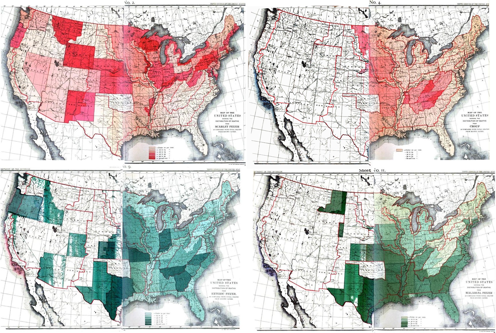 In the above maps, scarlet fever, diphtheria, consumption and old age do show a tendency to be more prevalent to the north. The old age we can sign off to social and cultural living habits and sociological behaviors. The clustering of old age percentages at the high value up north suggests you live longer if you live up north, than down south once you get older. Consumption has been the traditional disease linked to upper latitude regions where cold winter weather prevails. Scarlet fever and diphtheria could be assigned some ecological component to this finding, were it not for their ability to spread as contagion being passed from person to person. Colder weather and the force cohabitation for longer periods of time per day make for a very easy situation for this disease to be spread by way of domestic settings. Other diseases for the time such as catarrh and the influenza behaved much the same way when it comes to seasonal events.