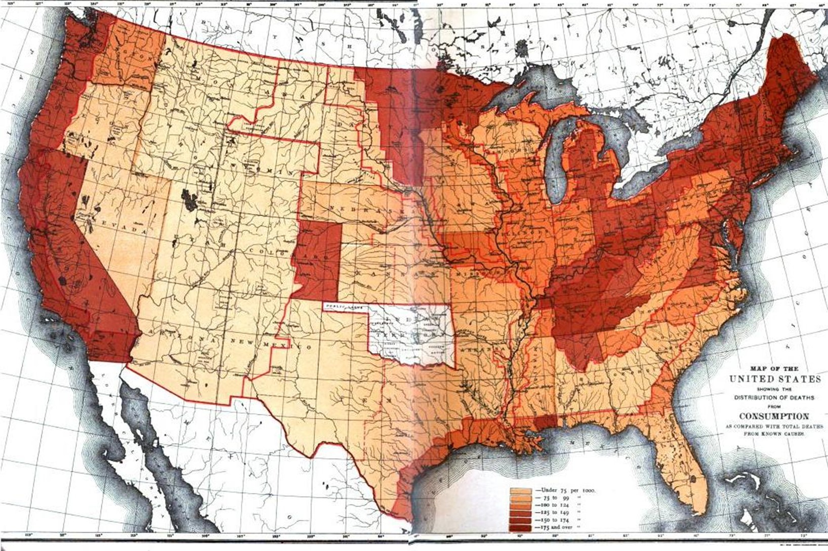 The last of the above three maps is on Consumption, also called Phthisis and Tuberculosis. This disease historically had associations with climate, weather and latitudes. It was considered a prevailing disease of many regions and the colder end of the temperate zone. There were several variations on how it presented, resulting in other disease names that were of the same origin. The classic example of this was scrophula, a disease manifested across parts of the neck, upper torso and face. Consumption is due to mycobacterium (fungal). The population pyramid provided by the 1890 census provides us with valuable insights into the disease and how it took its victims, usually in their 20s to late 30s, with women slightly more than men during those years in age. When reviewing the map of consumption, the following might help with answering the questions that follow.