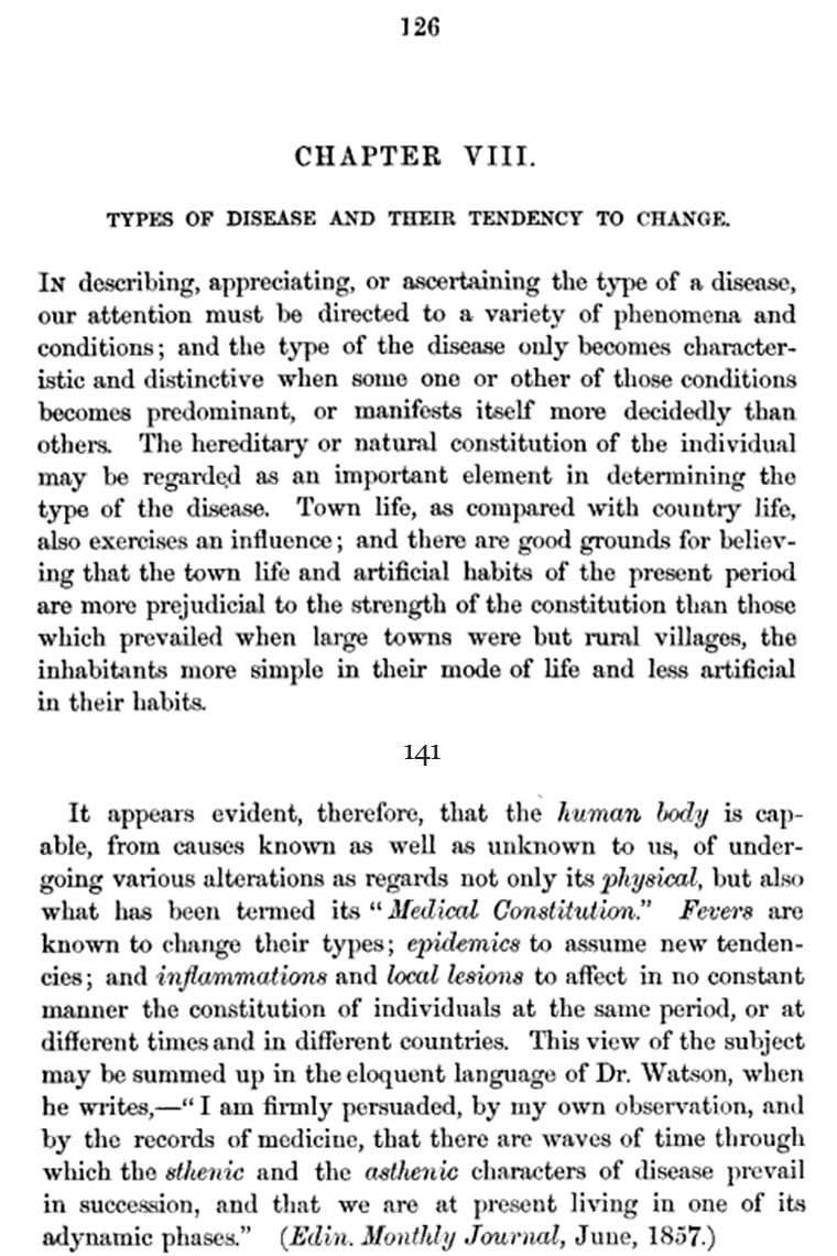 One theory that prevailed during this time (1860-1890), was the changes in type theory that some nineteenth century physicians linked back to Thomas Sydenham, ca. 1670-1690. The focus was on the different types of fevers that were observed. Sydenham noted certain kinds of settings, in particular living settings and degree of urbanization, had different fevers related to them. This philosophy was improved upon over the century and half due to more detailed observations made about fever related illnesses. Fever was at first considered a disease, but then differentiated into different types, with no knowledge of its cause. The lack of such knowledge was still quite evident in the mid-1800s as Aitkens developed his hypothesis on fevers and many other expressed similar ideas, like in the above quotes from Aitken’s book.