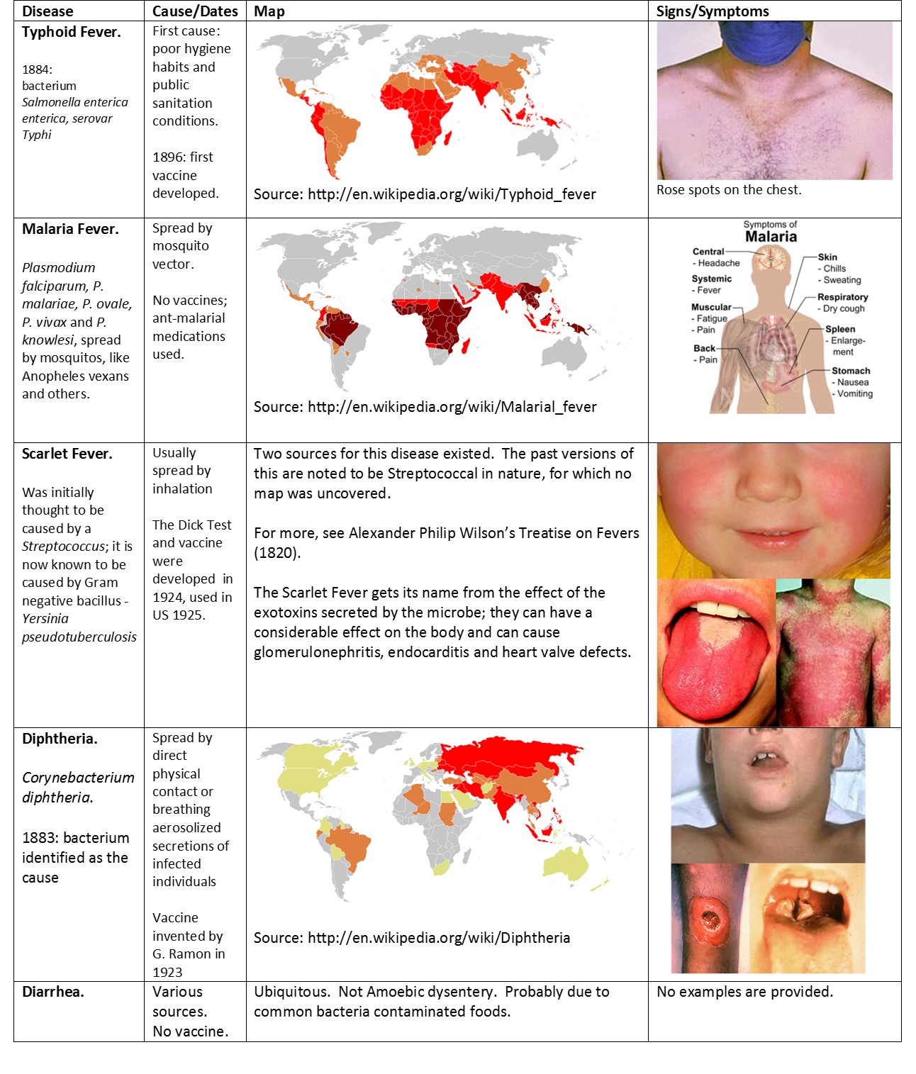 Note the more diffuse typhoid and diarrhea, and the lack of malaria, and the dense clustering of diphtheria in two places.