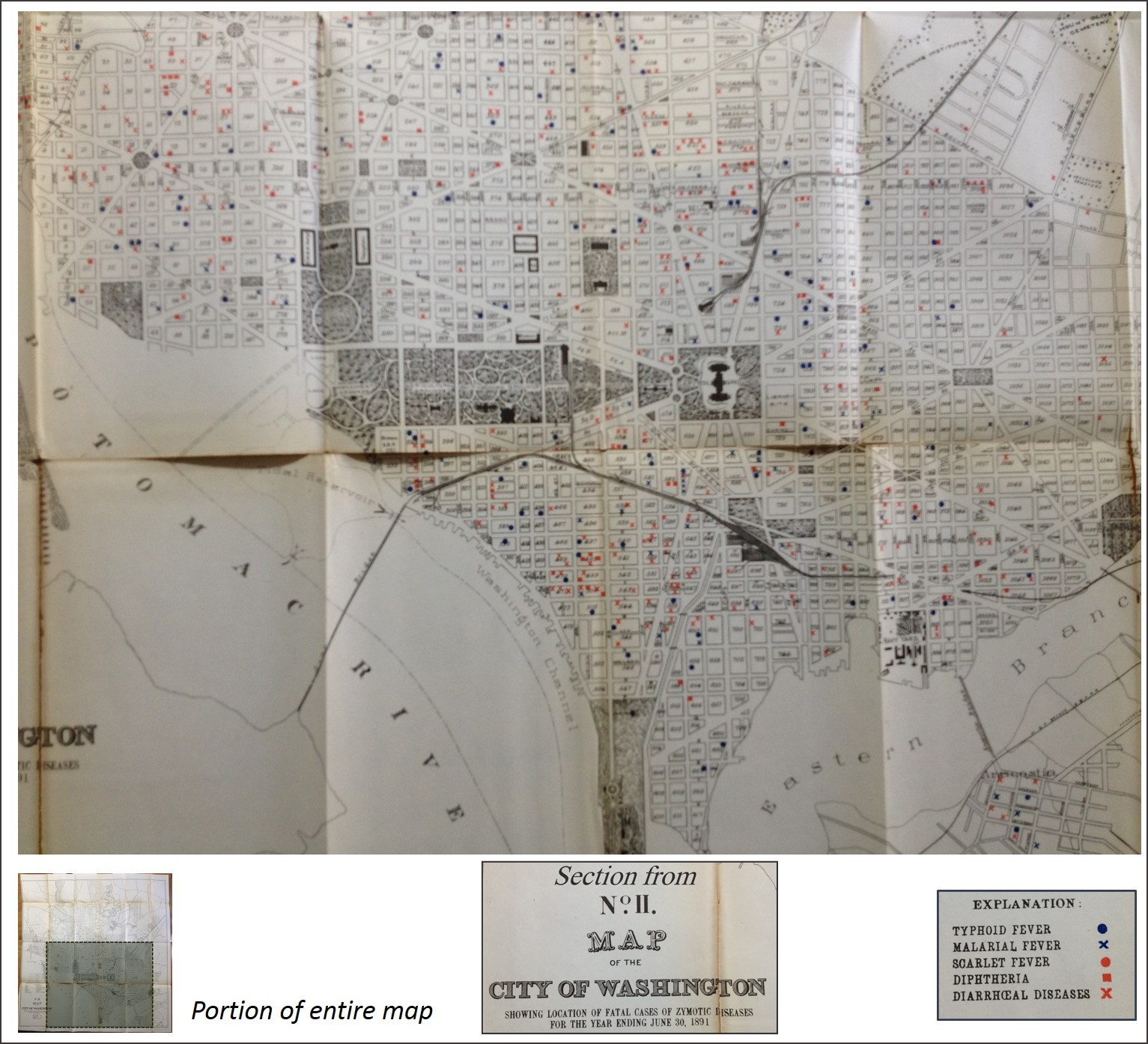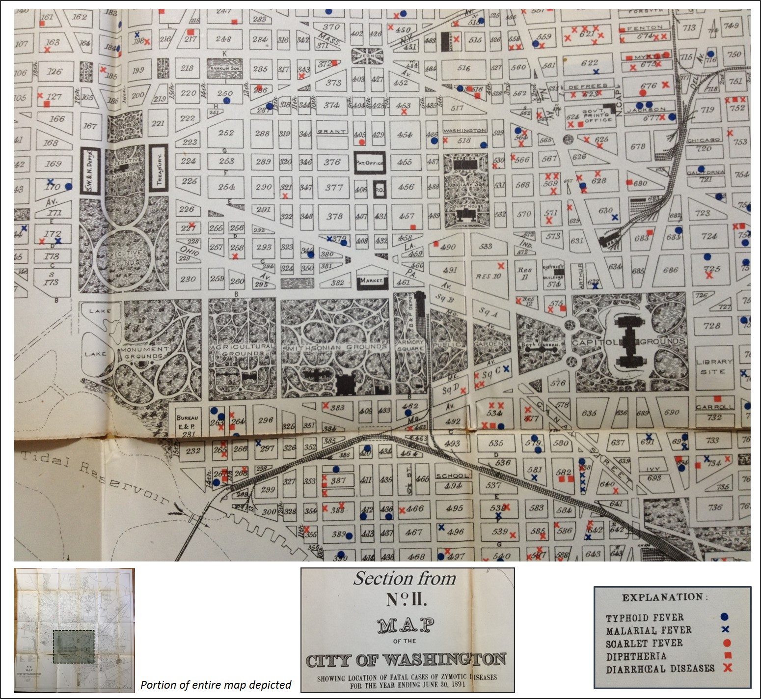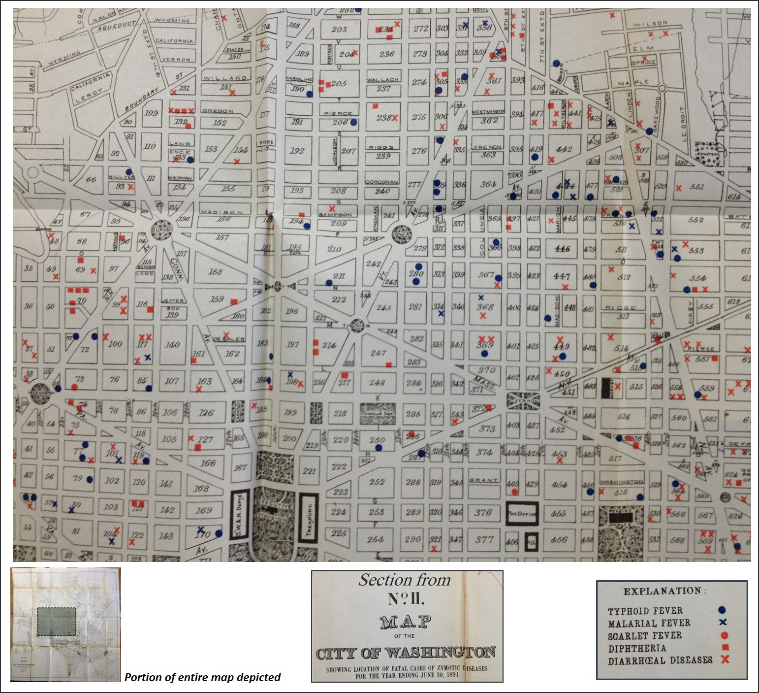 The following ‘Zymotic Diseases of Washington’ map reviewed was produced in June 1891. William Farr’s theory of zymotic disease (covered at the end of this page) was in its final years of existence, and had an impact on the knowledge based underlying health care and medicine that would add strength to some of the most important changes being made. The zymotic disease theory began with two important events in medical history–
