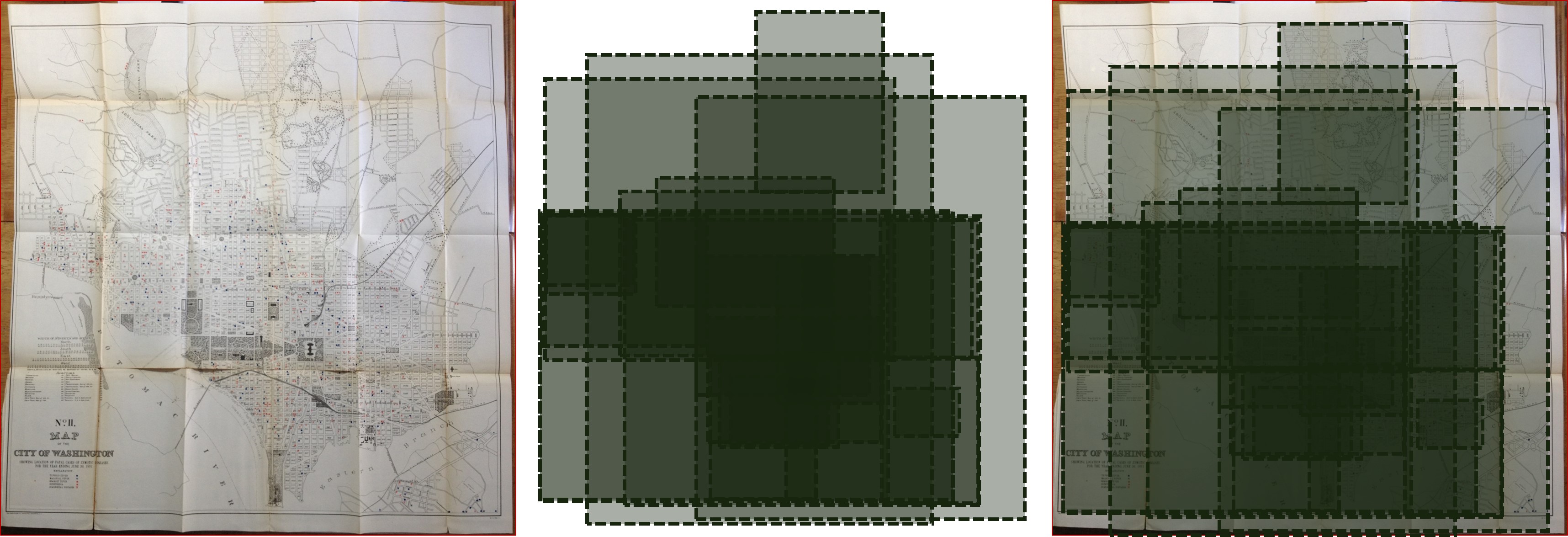 The above figure depicts the areas reviewed and the rectangles depicting their distributions. The bulk of the map was covered, some areas multiple times due to the nearest neighbor relationships. Overall focus is on the Capitol building and Smithsonian Park.