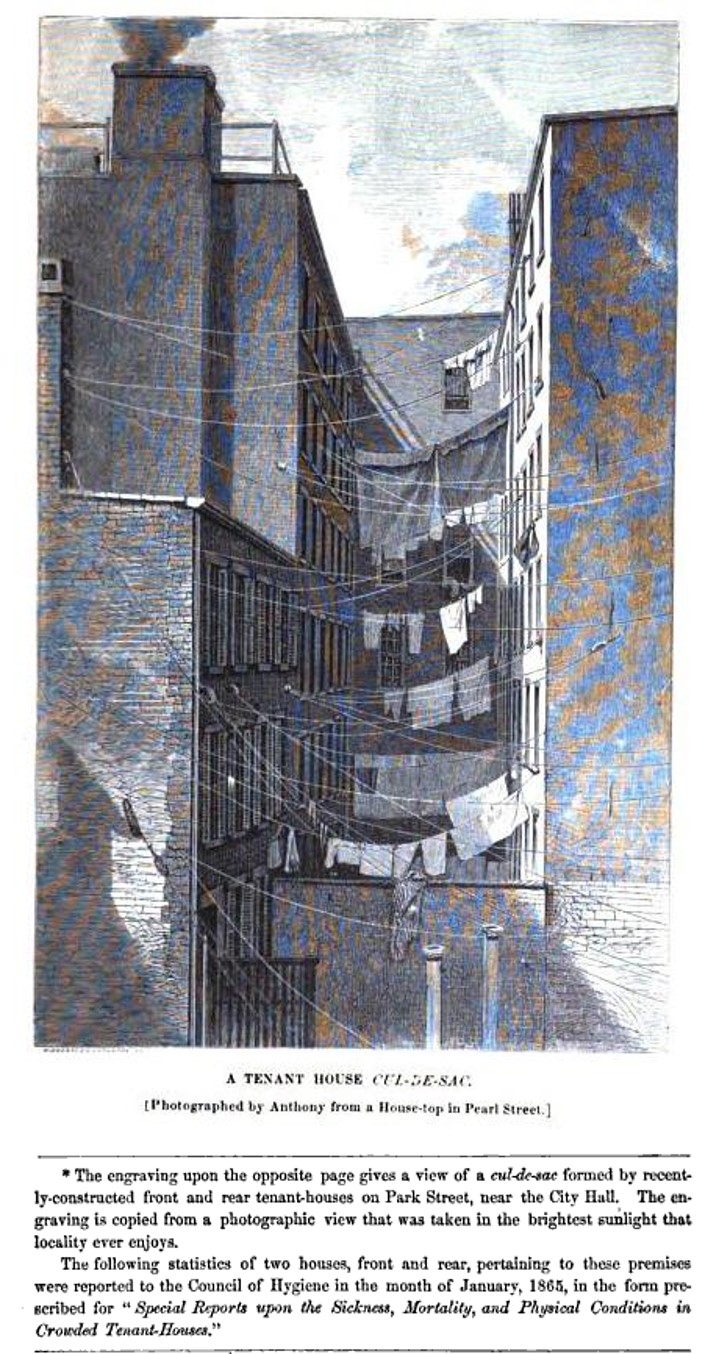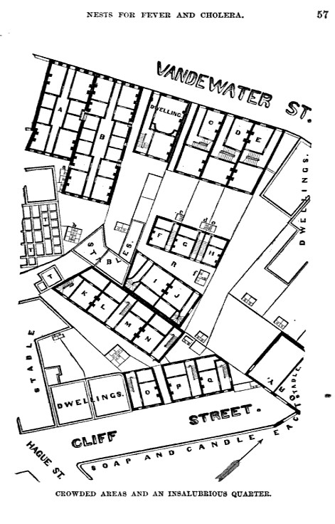 Communities. The most common diseases striking the city proper during this time were very much dependent upon how we lived. People were for the most part sloppy and resided in filth. Even though there were well groomed animals and neatly kept homes made of brick and stone, there were also the numerous shanties and wooden houses lining most of the streets, with the more heavily settled blocks lined with tenant houses and tightly pack main-frames with rear-houses raised in the alleys. Some of these houses were given a healthy personal water-closet setting, most had privies located on the river edge or draining into the back and side yards, some even emptying out into the soil below from set-ups located down in the basement. Privies in a multilevel tenant-home setting might only be located on two floors–the main floor or basement and the second floor, draining down a long sewage pipe and finally making its way into the sewage lines below, and on occasion gushing back up into the basement due to saturation of the soil, blockages or recent flooding.