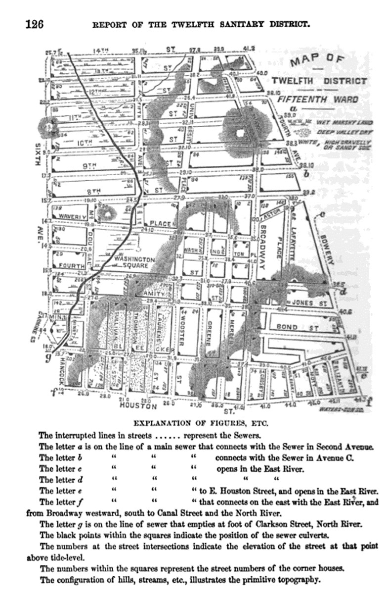 Several times in New York history we see this sudden focus on mapping, resulting in numerous maps included in the journals. This took place around 1800 when the Governor of New York asked the physicians on the state board to require doctors from the different counties report on the medical topography, climate, hydrology, geography, medicinal plants, disease natural history, etc. for their region. This emphasis on producing medical topography reports on a regular basis re-emerged in the 1804s, resulting again in numerous articles with maps depicting many of their claims or findings. This document represents one of several that came about during this time due to yet another series of bills passed requiring thorough reviews be made of developing urban centers. Being both one of the fasting growing and most certainly the largest city, New York tried to take an advanced position in this part of the sanitary movement. New York had some of its first of these types of events emerging in the 1860s, but the series presented here (the city and the page on the upstream Hudson Valley River reports), represent a considerable change in this reporting practice.