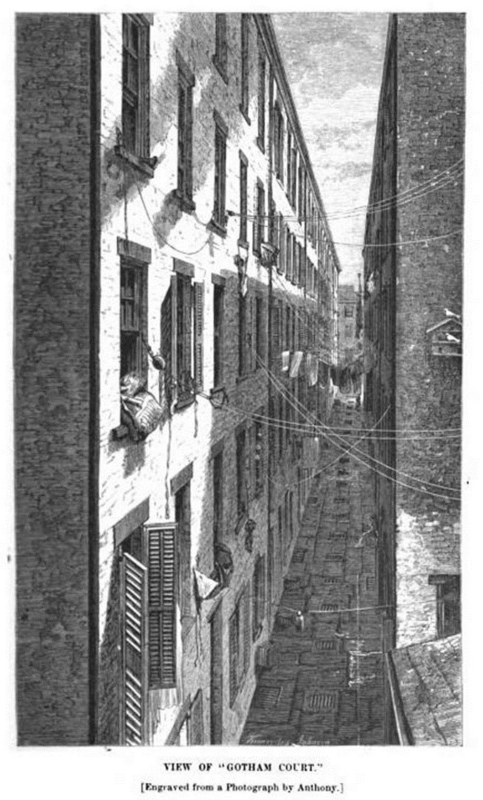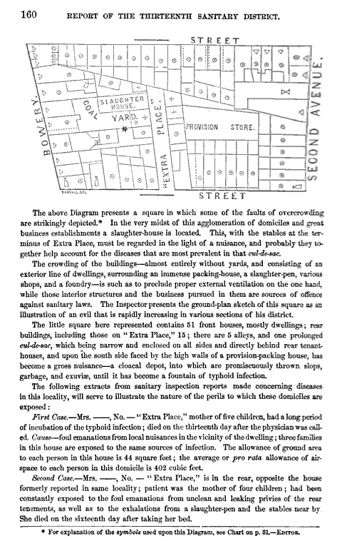 Slops, garbage and exuviae turned a section of the thirteen sanitary district into a what was called a cloacal depot, one of the filthiest, smelliest places in the city. This one was situated just east of the Bowery. A packing house for fresh cut meats added to the likelihhod of illness recurring in this region due to typhoid. Two cases were noted around the section of street called “Extra Place”. These are described in the text below. In the double row of buildings beneath the word street is a row of four rear-houses, the unhealthiest places of all aside from shanties and the actual site where the disease was generated. Notice the Provisions Store in close vicinity to this setting as well.