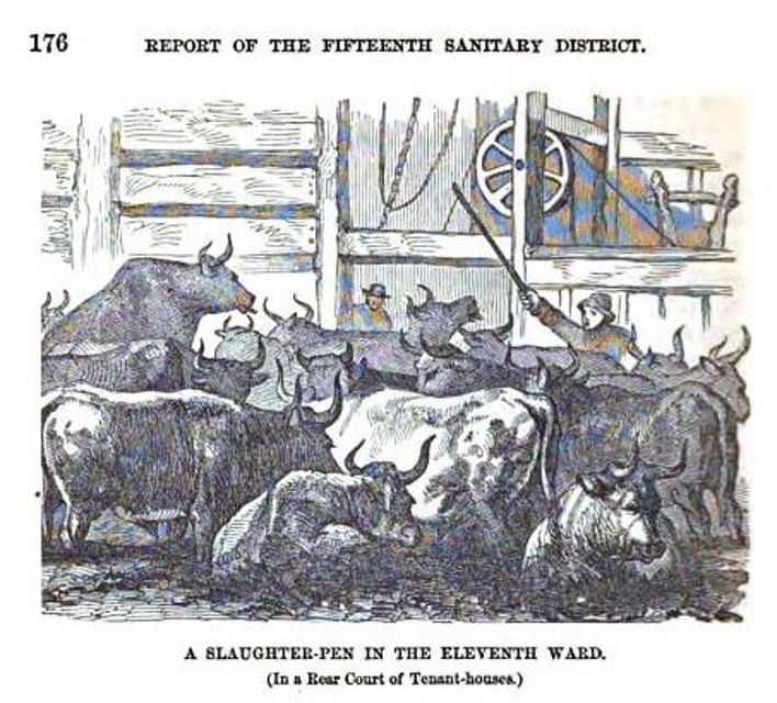 Suspicions about possible causes for disease and the miasma or its new theoretical equivalents had obviously become quite complex by this time. Bone boiling operations, fat-rendering and gut-cleaning operations, breweries, distilleries, packing-houses, hide and tanning facilities, cattle yards, slaughterhouses all had their features considered to be unsanitary that had to be prevented. Business-generated and personal human waste were concerns. Dumps, compost operations settings, places where the dead are made to lie all had to be inspected as well for any risks of producing a new gas or effusion or source of water contamination for local drinking wells.
