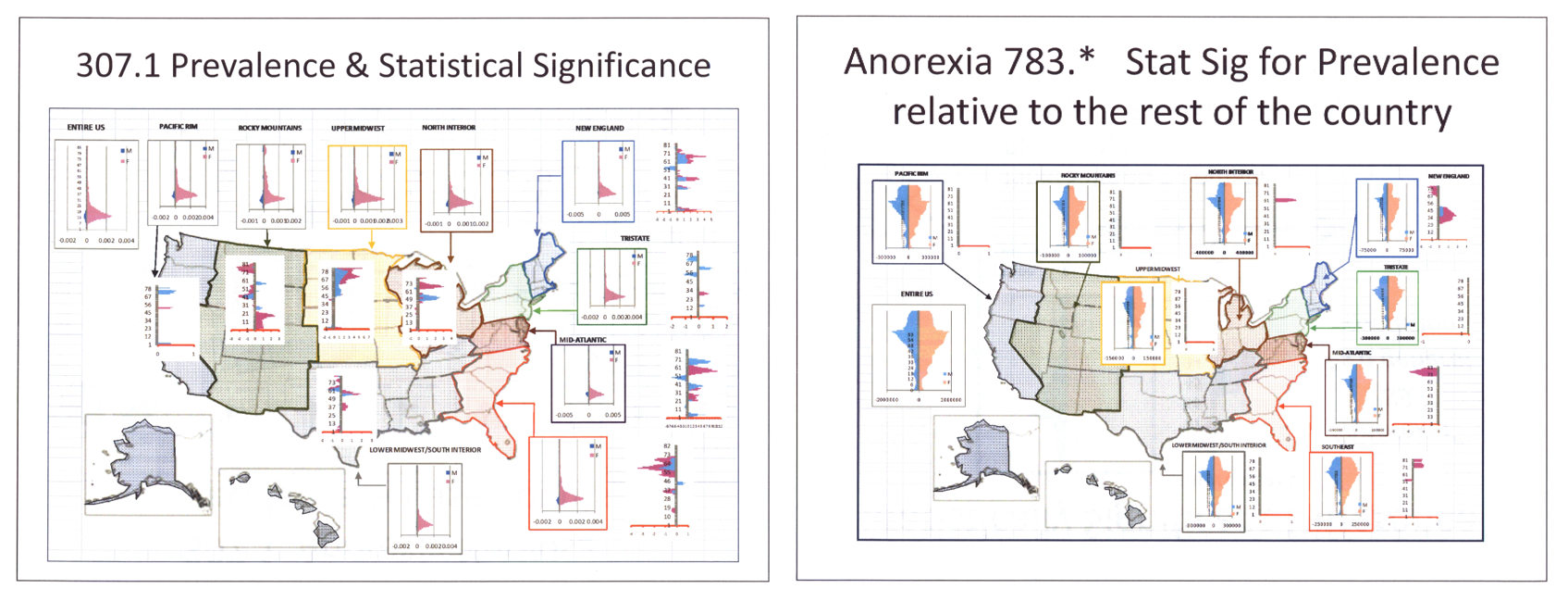 Anorexia nervosa has a very unique age-gender-linked presentation. Its occurence peaks at a very specific age, mostly in females, pretty much ending in the mid-20s. The related diagnosis Bulemia then continues into the 20s and even 30s. The above regional map compares case distributions between regions. Based on the Statistical Significance peaks for Anorexia nervosa, the Rocky Mountains and perhaps Mid-Atlantic Regions depict peaks suggesting these two regions are more likely to experience more cases than the rest of the country. For Anorexia 783.*, stat sig suggests the peak region in the country for this condition is the New England area. In another study of chronic disease management in general, this region is also the “sickest” regarding the existence of higher IPs for most other prevalent chronic diseases in general (as an example, the ‘heart failure’ study outcome follows).