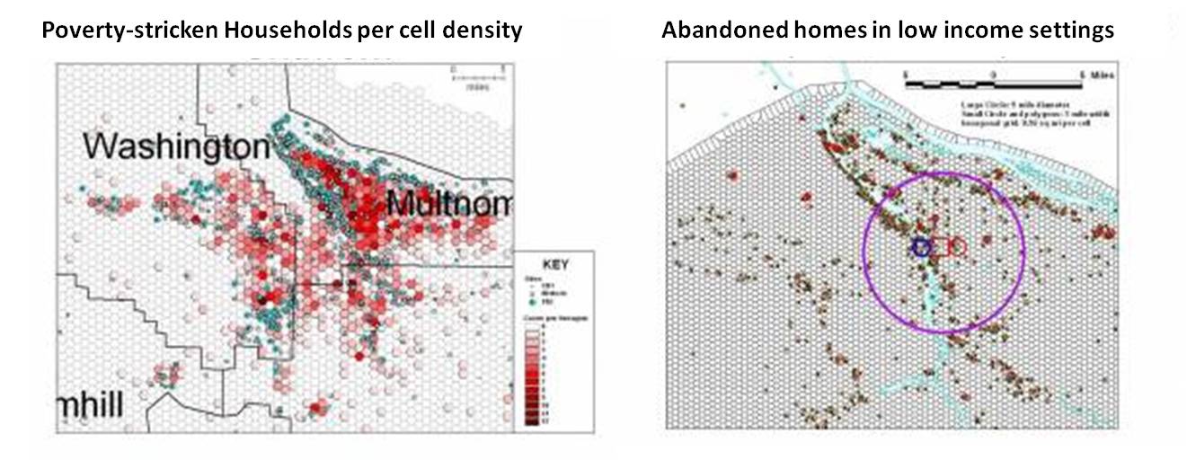 Poverty, Health and Abandonment of Homes, a Theoretical map. The above true map of toxic regions within an urban center also has a link to socioeconomic information for the same region. Population pyrmids can be used to determine where the largest density of high risk people exist, such as the poorest of the poor, the largest density of oldest age groups (65-75, and 75+), the mothers of child-bearing age and their children of the 0-2,3-9 and 10-17 yo age groups. These are all very high risk individual regarding population health. Each of these age-gender groups (and ethnic groups if that information is available) has specific medical and economic needs. Placement of medical services, schools, counseling services, community police settings, community meeting establishments, recreational areas, churches, grocery stores, etc. can be evaluated. Various forms of criminal activity can be monitored. Gang-related regions can even be identified based on criminal activity and graffiti history.