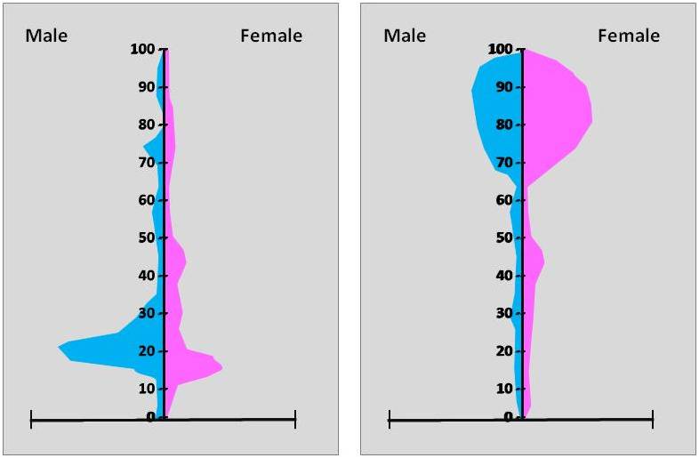 The above ways in which disease and the aging phenomena impact the body result in particular age-gender pyramid shapes, that make the progress of a long term disease understandable and often very predictable.